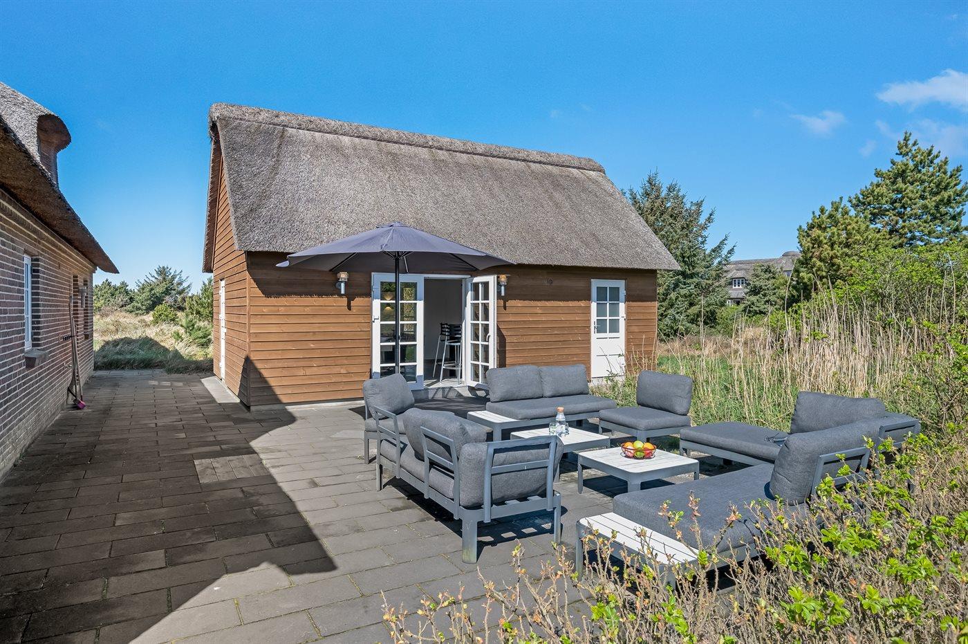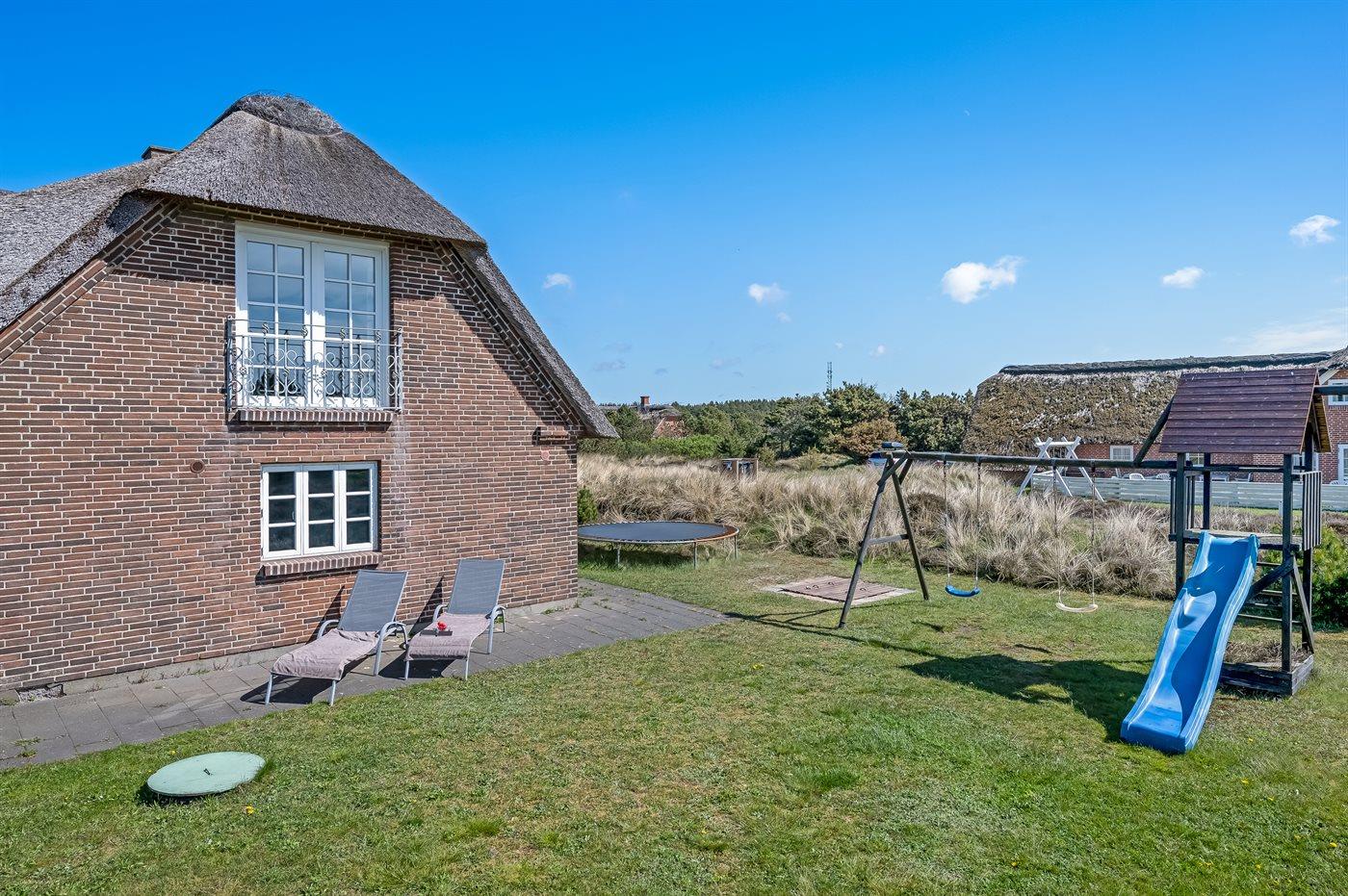Charmantes Reetdachhaus nahe Blåvands Strand mit Pool, Sauna und großem Spielbereich auf 2500 m² Naturgrundstück.