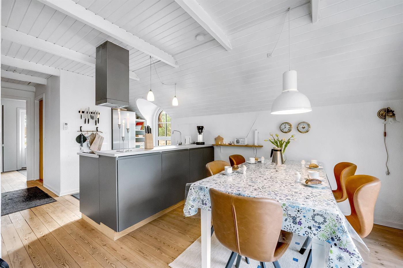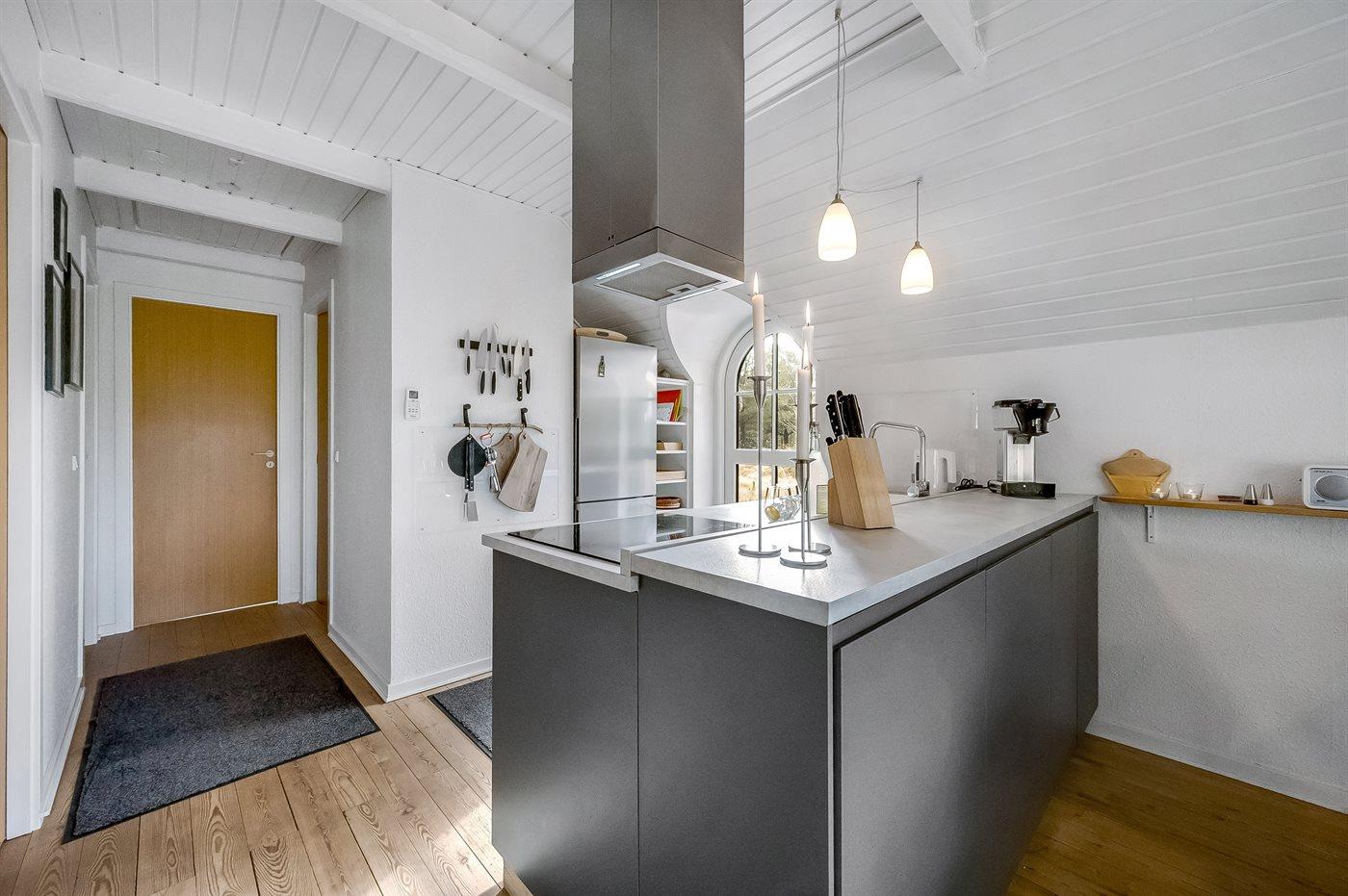 Die Küche ist mit Kühlschrank ausgestattet. Außerdem gibt es 4 Induktions-Kochzonen, Umluftofen, Mikrowelle sowie Geschirrspüler.
