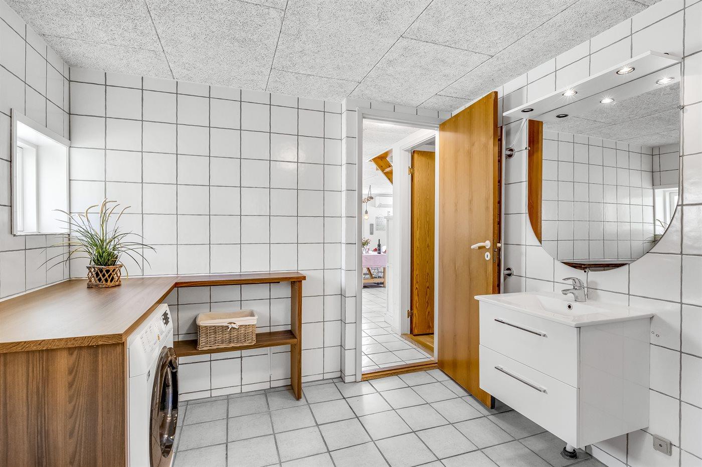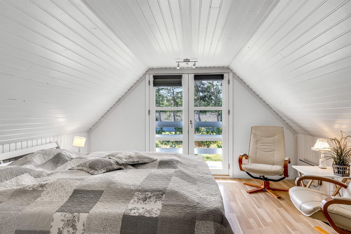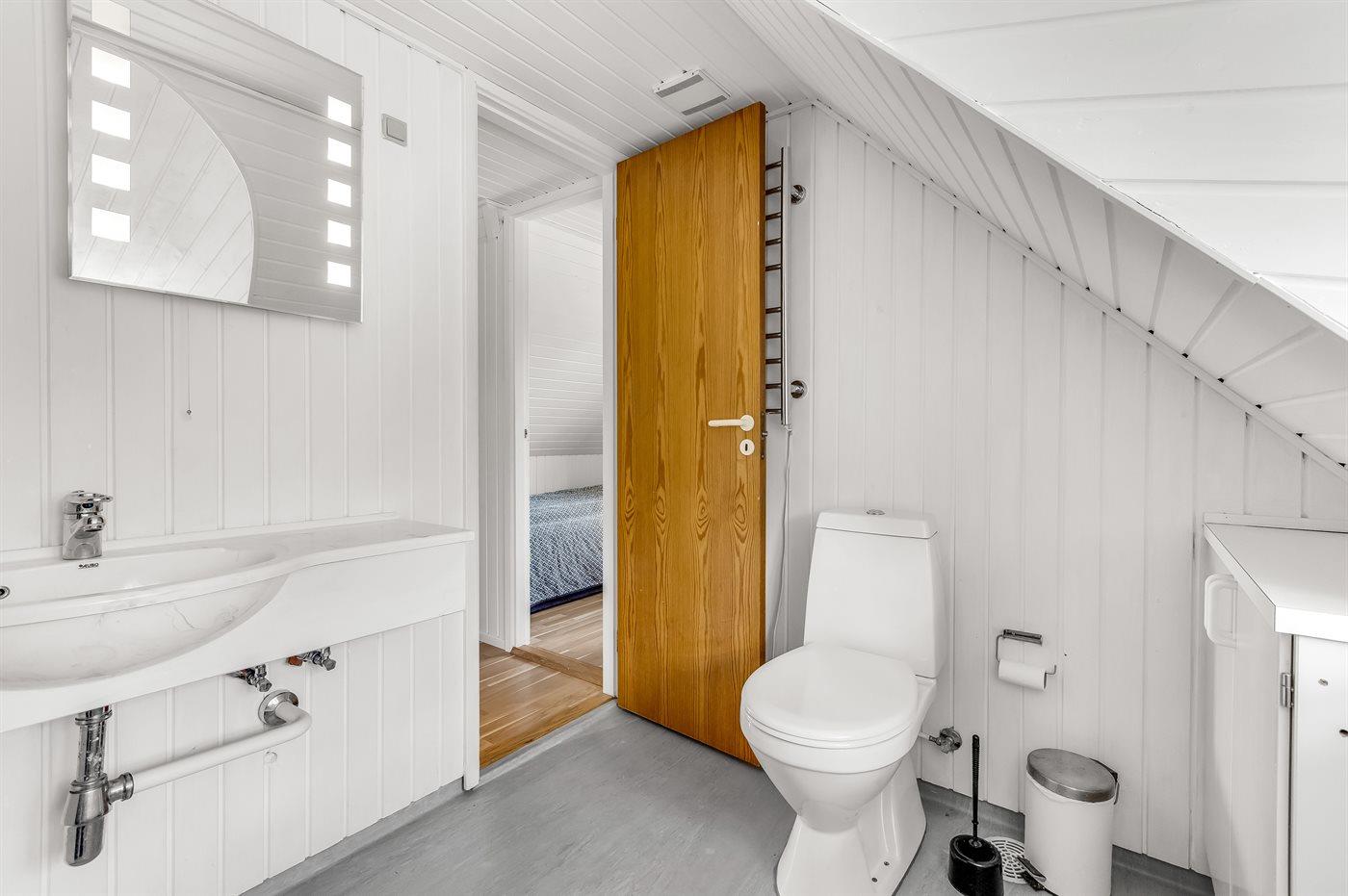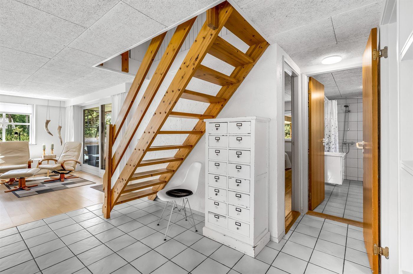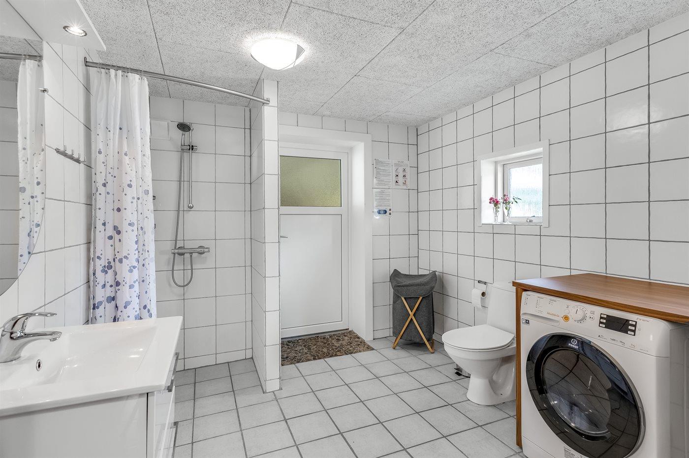 Im ersten Stock befinden sich 3 der 4 Schlafzimmer des Hauses. Davon sind 2 Zimmer mit Doppelbetten und 2 mit Einzelbetten ausgestattet. Hier befindet sich außerdem ein Badezimmer. Das größte Badezimmer ist im Erdgeschoss und verfügt über eine Dusche, eine Waschmaschine, einen Trockner und eine Toilette. Im Erdgeschoss befindet sich auch das letzte Schlafzimmer des Hauses, ausgestattet mit einem Doppelbett und viel Stauraum.