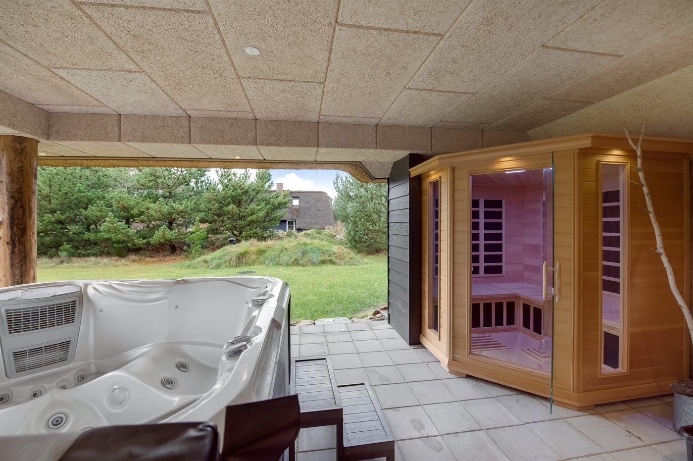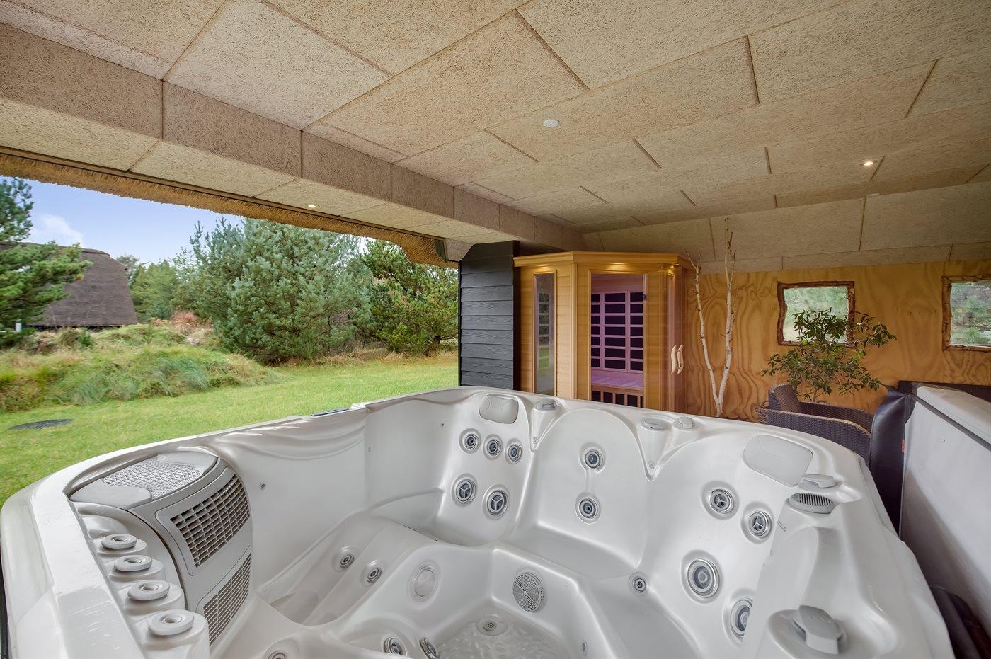 Die einzigartige überdachte Terrasse bietet Möglichkeiten zum Entspannen und genug Platz, um zusammen Zeit zu verbringen, zum Beispiel im herrlichen Outdoor-Whirlpool oder in der Infrarotsauna. Außerdem gibt es ein schönes Loungesofa, auf dem Sie mit ein paar guten Drinks diese phantastische Umgebung genießen können.