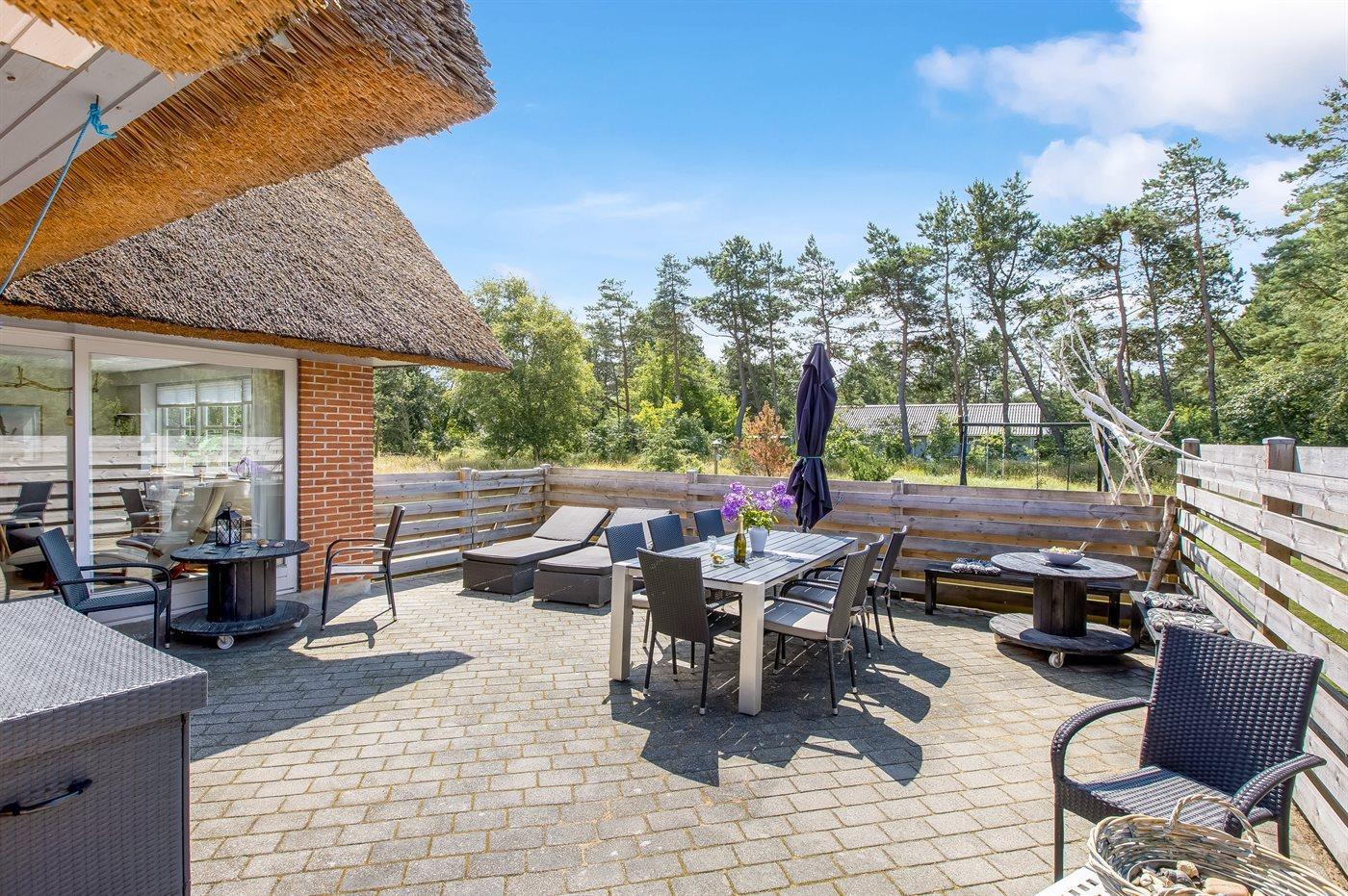 Im Außenbereich wartet eine herrliche Terrasse auf einem schönen Naturgrundstück auf Sie. Hier könne Sie an Sommertagen die Sonne genießen und mit der ganzen Familie ein leckeres Urlaubsessen auf dem Grill zubereiten.
