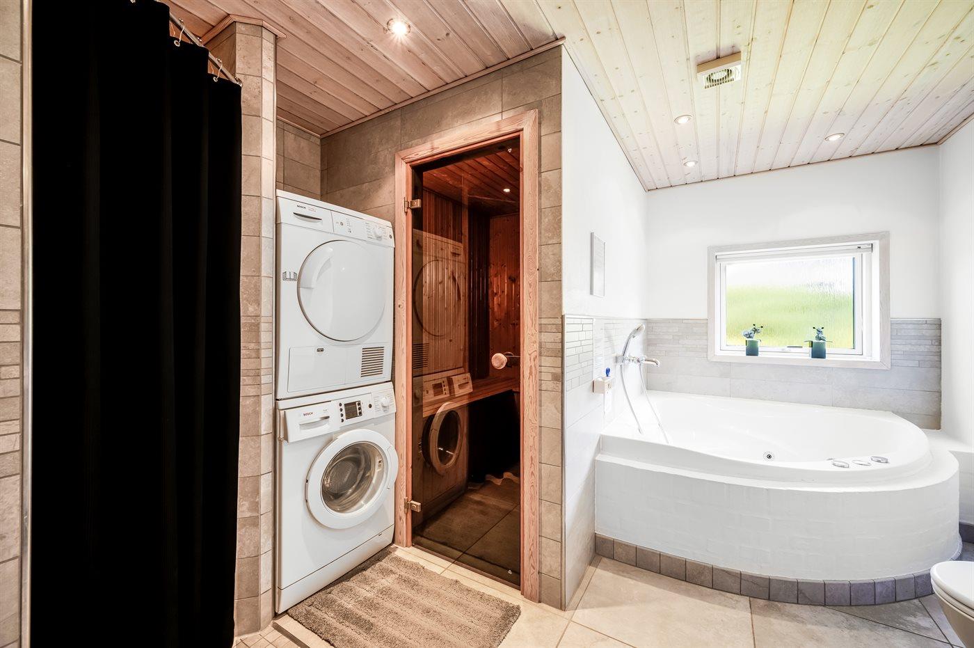 Im großen Badezimmer befinden sich eine Duschniche, eine Toilette, ein Whirlpool sowie Zugang zur Sauna. Zudem gibt es ein Gäste-Toilette. Der Whirlpool bietet Platz für 2 Personen.