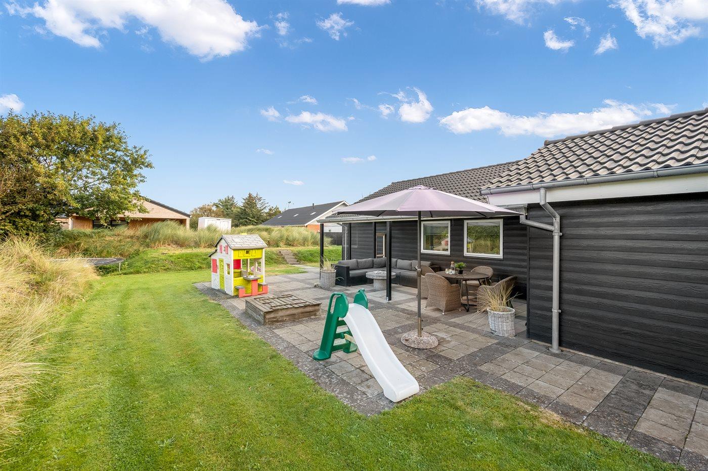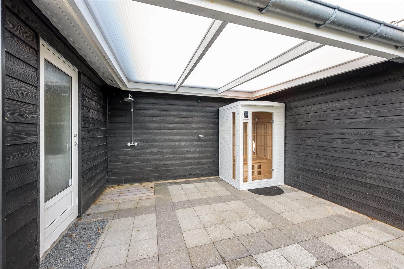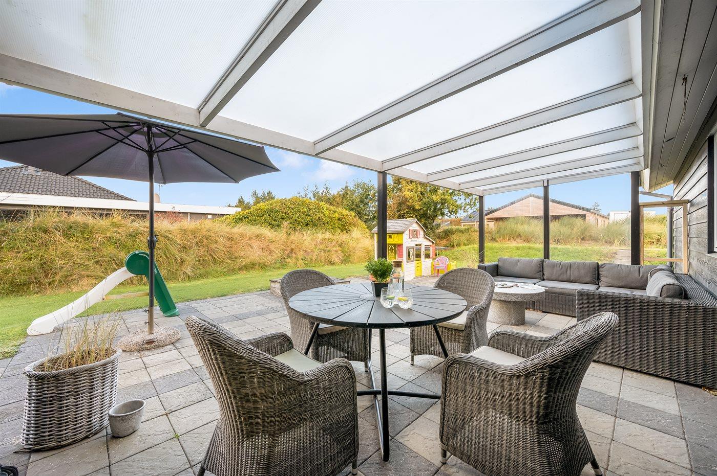Ein zentral gelegenes Ferienhaus in der Nähe von Strand und Stadt. Das Ferienhaus ist sowohl für einen aktiven Urlaub als auch für pure Entspannung geeignet, da es sowohl einen großen Aktivitätsraum als auch eine schöne, große und teilweise überdachte Terrassenfläche mit einem 6-Personen-Außenwhirlpool (Standwasser) und einer Außensauna gibt.