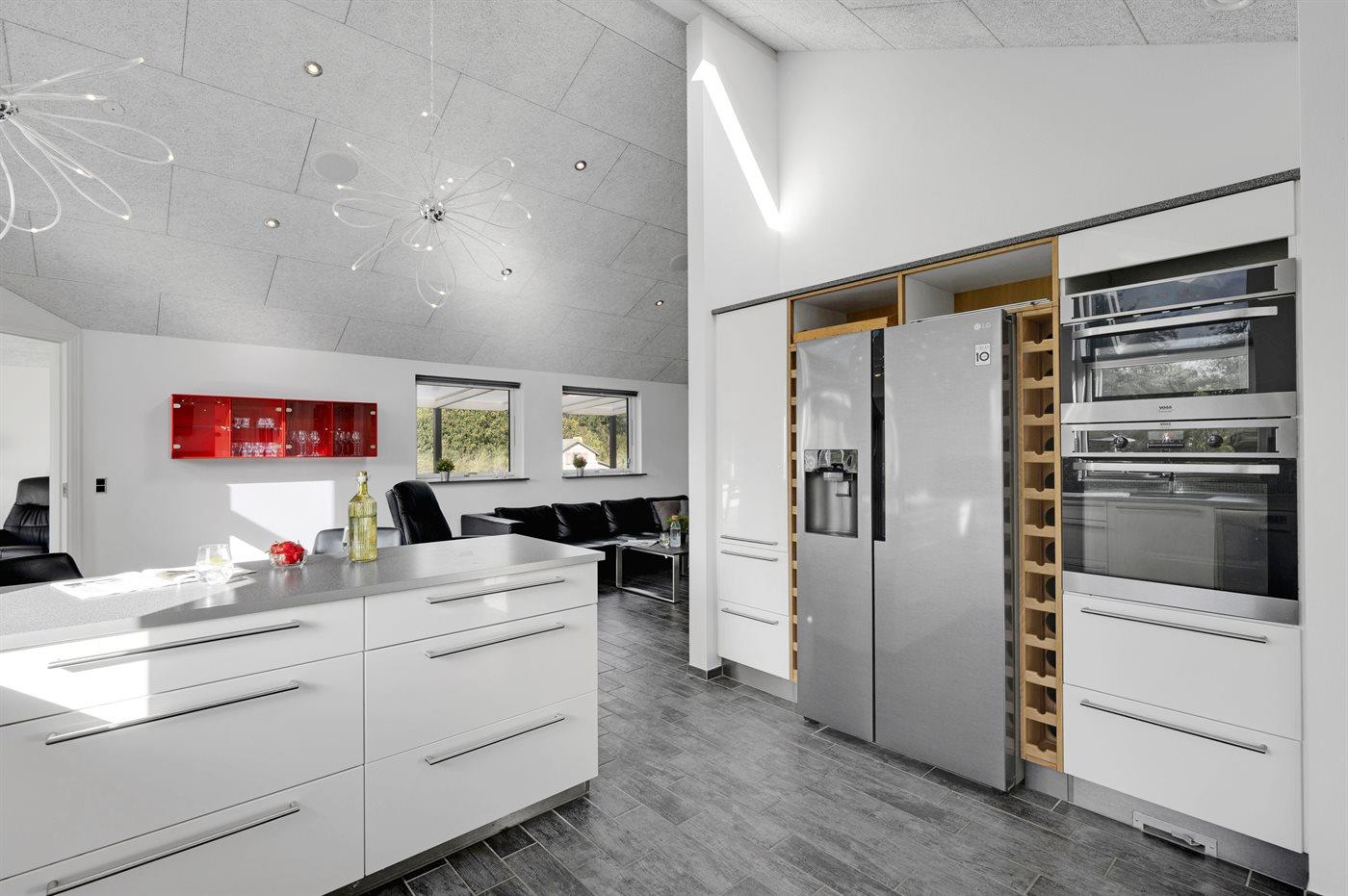 Die Küche ist mit amerikanischem Kühlschrank ausgestattet. Außerdem gibt es 4 Induktions-Kochzonen, Umluftofen, Mikrowelle sowie Geschirrspüler.