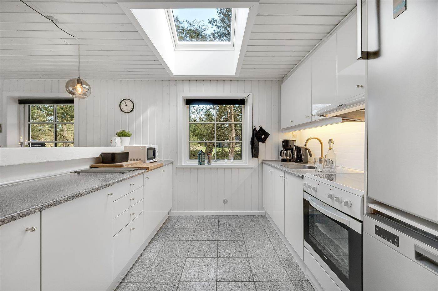 Die Küche ist mit Kühlschrank ausgestattet. Außerdem gibt es 4 Keramik-Kochfelder, Umluftofen, Mikrowelle sowie Geschirrspüler. Fußbodenheizung in der Küche.