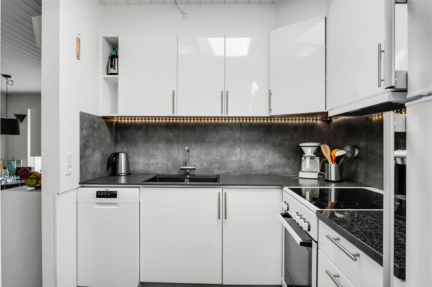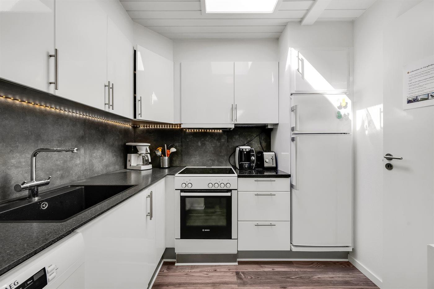 Die Küche ist mit Kühlschrank ausgestattet. Außerdem gibt es 4 Keramik-Kochfelder, Umluftofen, Mikrowelle sowie Geschirrspüler.