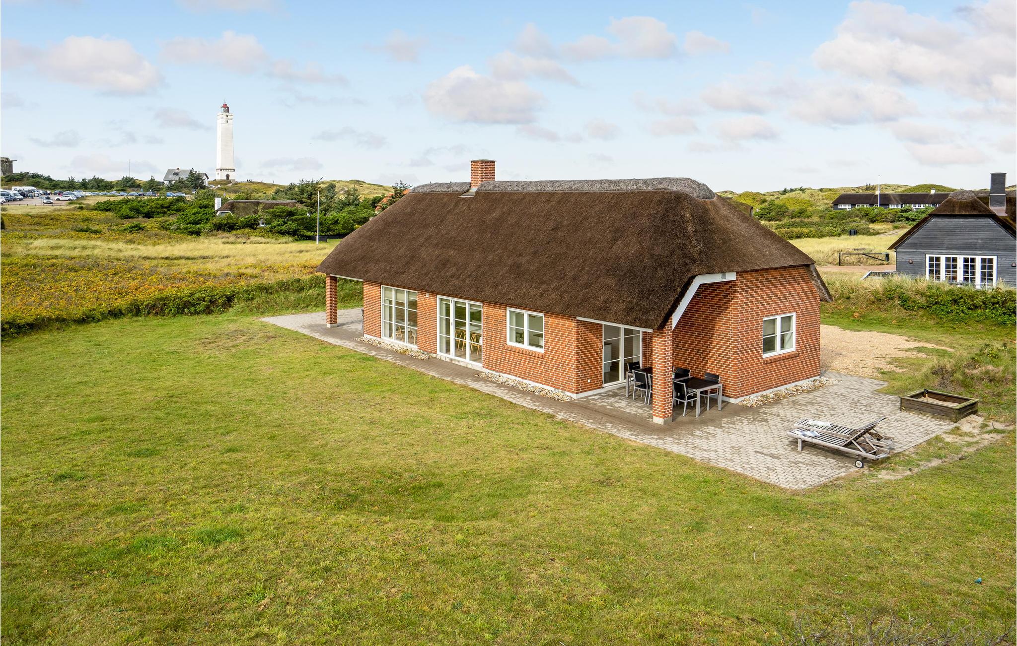 Luxuriöses Ferienhaus in Blåvand mit Strohdach, Kamin und direktem Dünenblick, perfekt für einen erholsamen Urlaub am Meer.