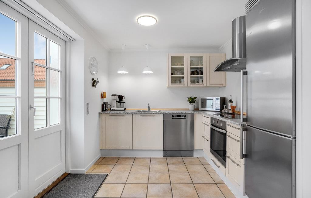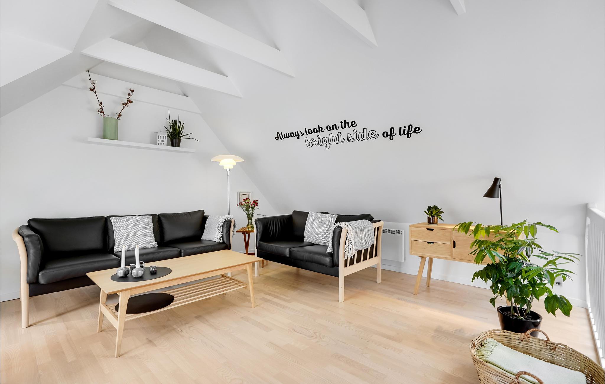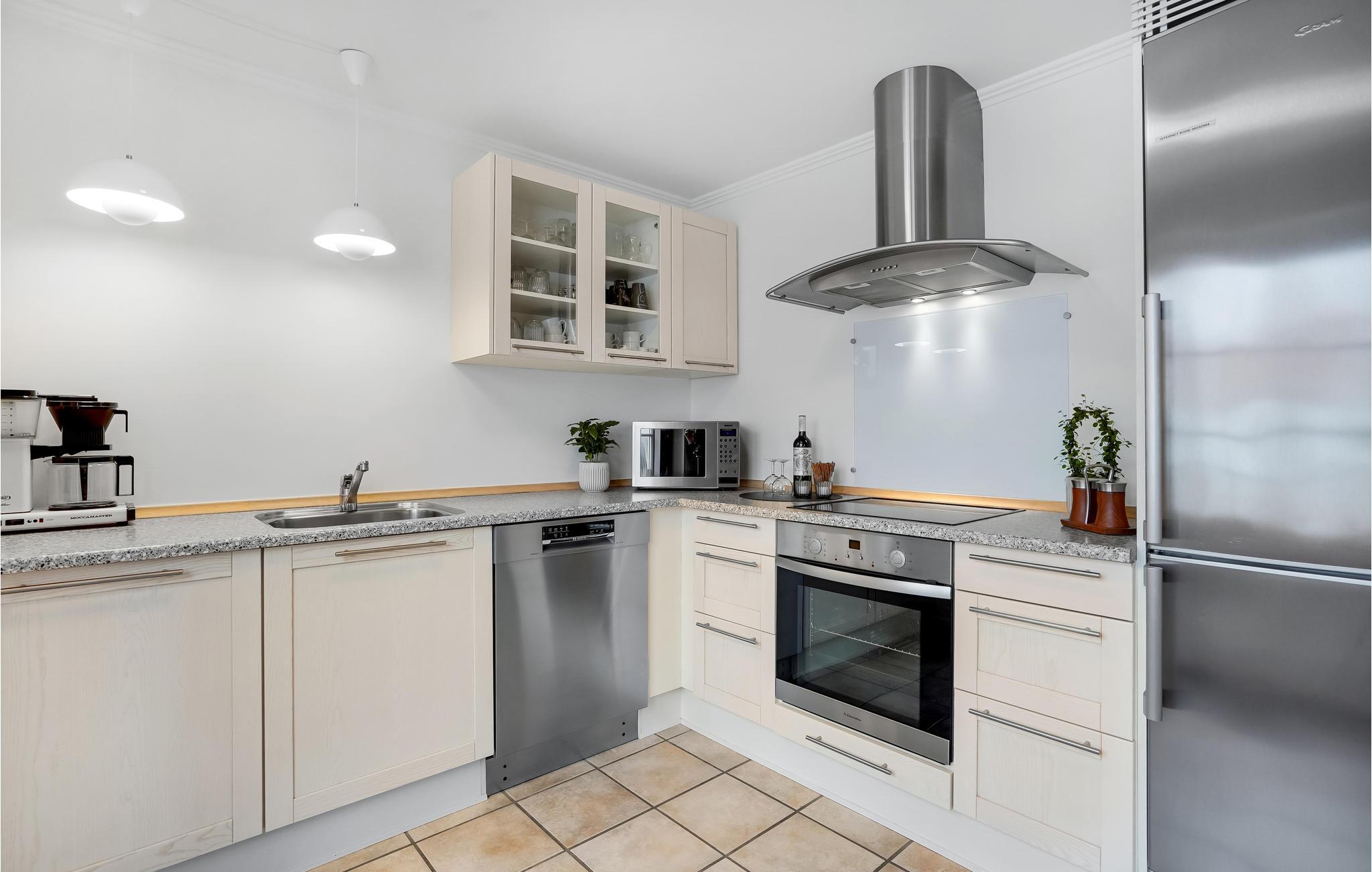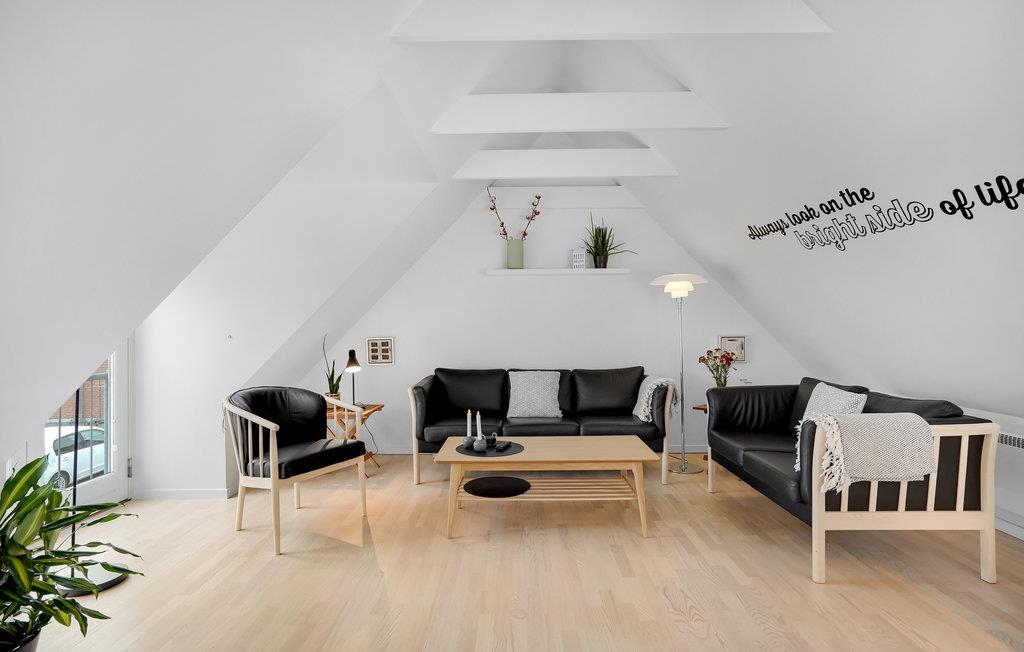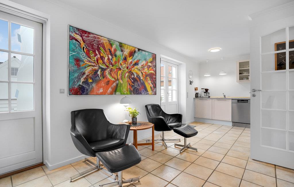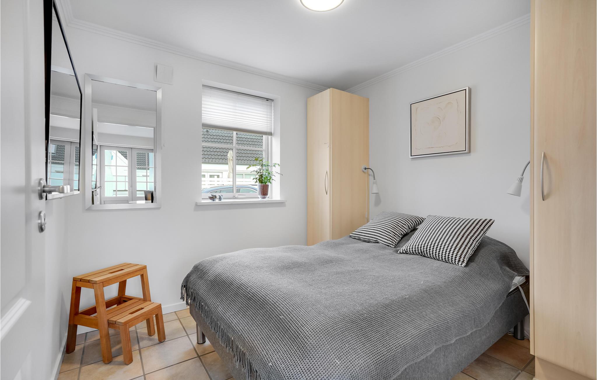 Zentral gelegene Ferienwohnung, hier haben Sie optimale Möglichkeiten, die vorhanden Geschäfte und Cafés im Urlaub zu nützen. Die Fläche verteilt sich auf zwei Etagen. Im Erdgeschoss ist Bodenheizung und hier spielt sich das soziale Leben in der Wohnküche ab. Von der in einer Ecke gelegenen Küche kann der Koch auch das gesellschaftliche Geschehen mitverfolgen. Vom Wohnraum geht es direkt in ein Schlafzimmer. Im Erdgeschoss ist auch ein schönes Badezimmer mit Whirlpool und Sauna. Die Decken im 1. Stock sind bis unter den First offen. Diese Etage hat ein Wohnzimmer, helle Fußböden und zwei französische Altane. Es gibt auch ein Schlafzimmer, dessen eine Wand von einem Kleiderschrank mit Schiebetüren geformt wird. Vor der Wohnküche ist eine sichtgeschützte Terrasse nach Westen, hier werden Sie gepflegt im Freien speisen, sei es zu Mittag oder beim abendlichen Grillen. Vor dem Haus sind der Parkplatz und eine kleine Terrasse mit Morgensonne.