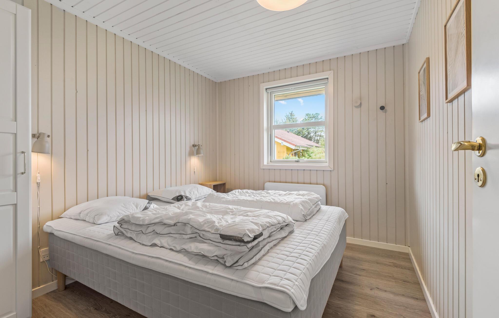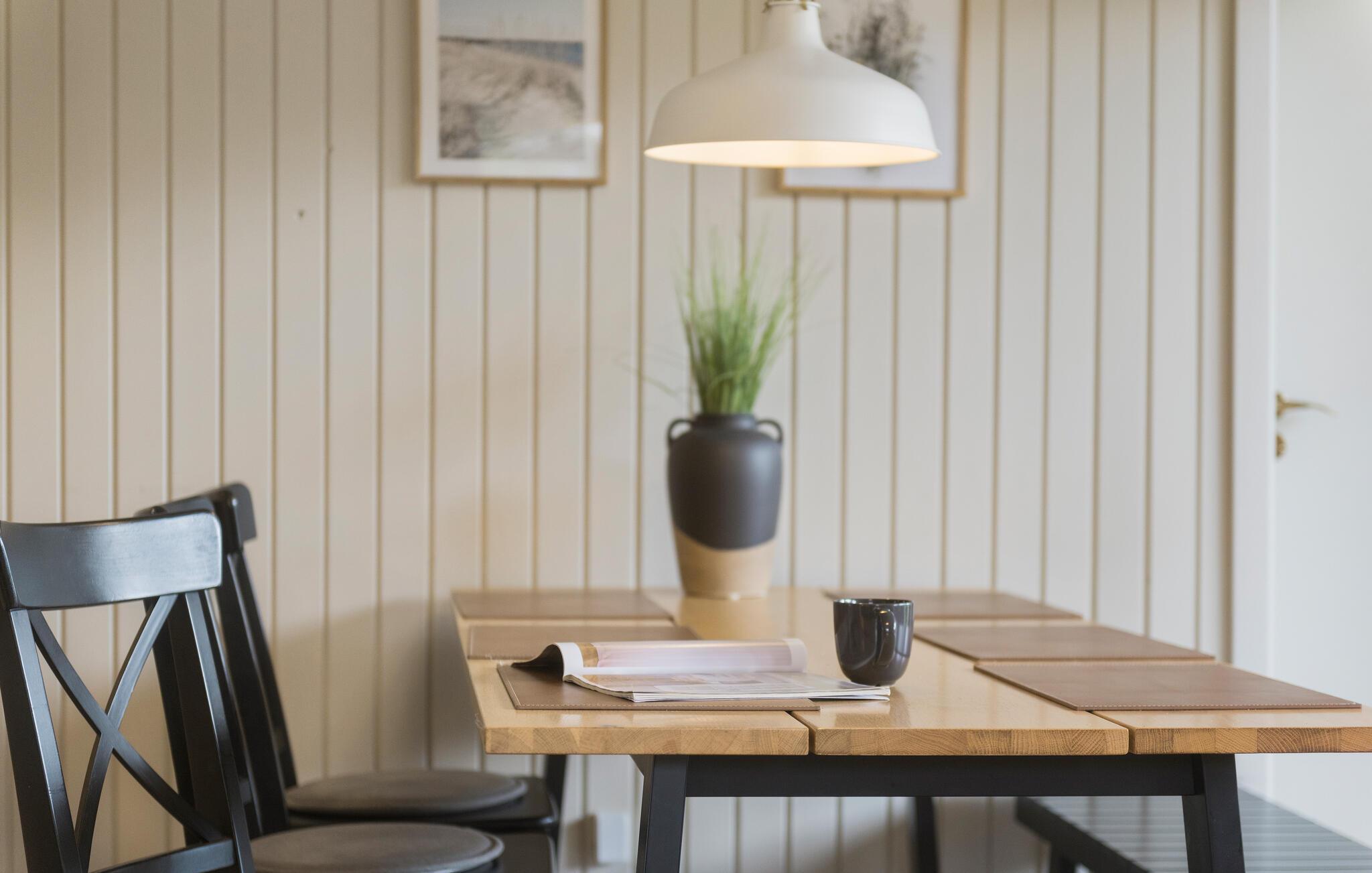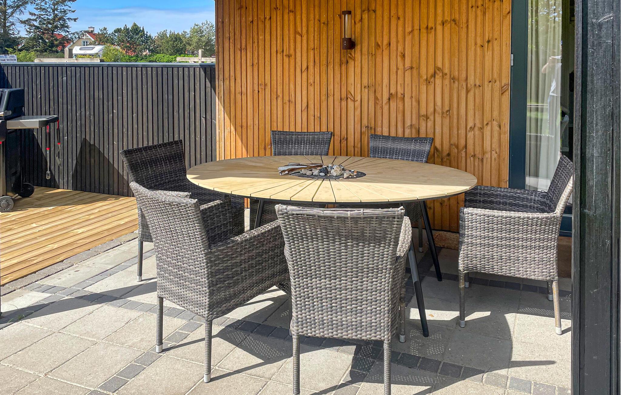 Genießen Sie einen erholsamen Aufenthalt in diesem reizvollen Ferienhaus, das durch seine malerische Lage in Blåvand besticht. Der großzügige Wohnbereich bietet behagliche Sitzgelegenheiten und einen herrlichen Blick auf den gepflegten Garten. Die offene Küche lädt zu gemeinsamen Kochabenden ein, und auf der Terrasse können Sie Ihre Mahlzeiten an der frischen Luft genießen, während Sie die frische Westküstenbrise spüren.