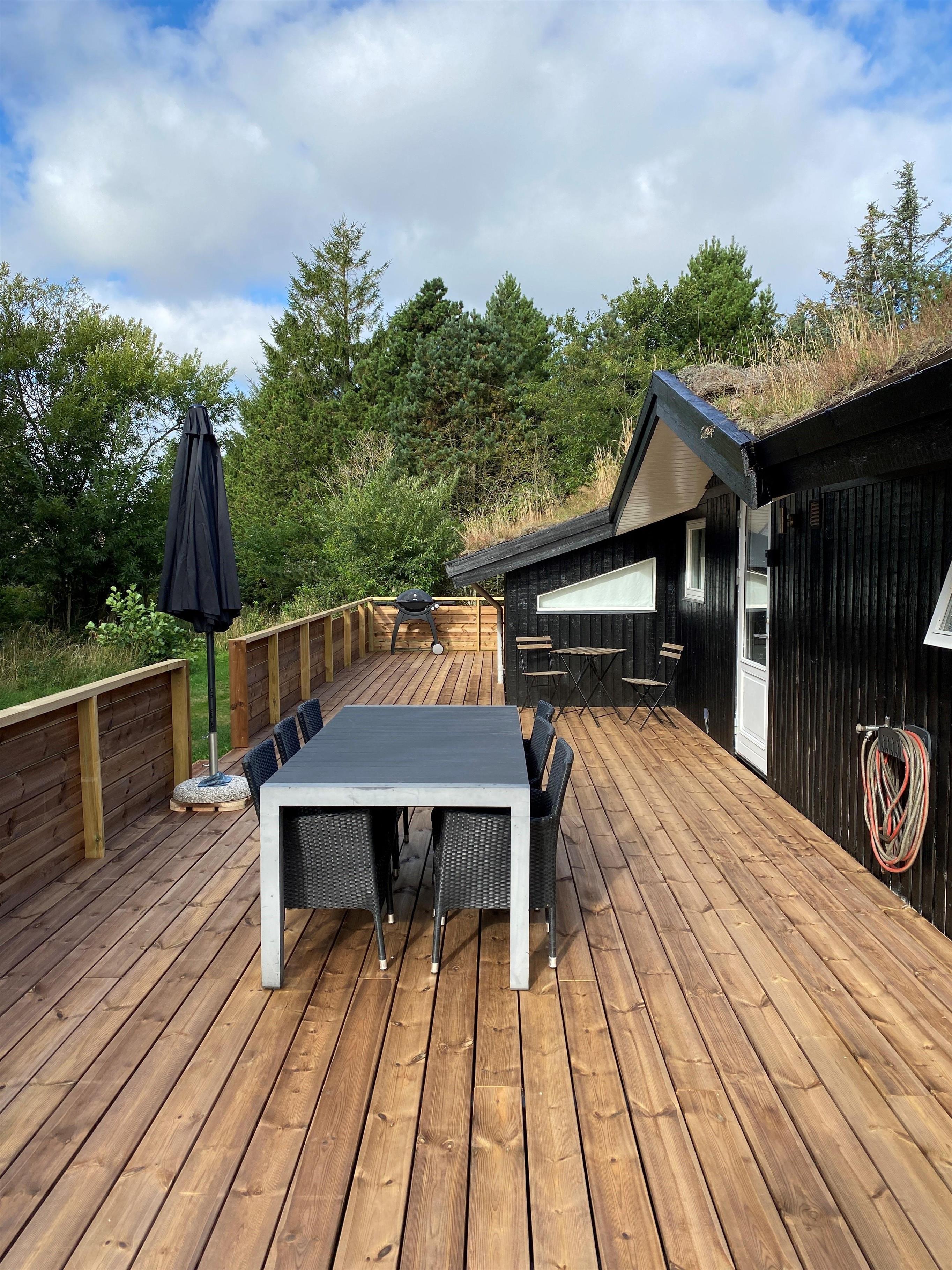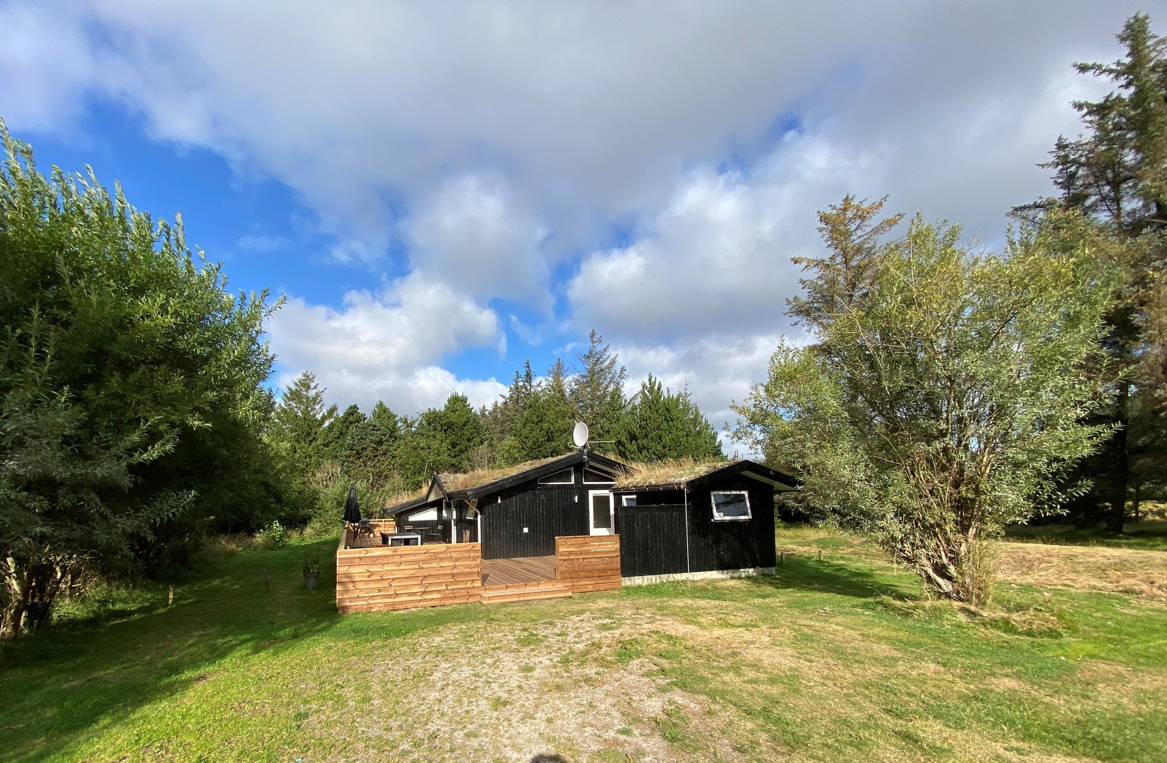 Ein gutes Holzhaus mit Grasdach neben der Mini-Golf Anlage. Das Haus hat feste Teppichböden in allen Aufenthaltsräumen. Es befindet sich auf einem Naturgrundstück, mit grosser, teilweiser überdachter Terrasse, windgeschützt, sonnig und schattig hier gibt es auch ein schönes Wildnesbad wo man abslappen kann unter die Sternen mit einen Glas sekt. 1 doppelbett. 2 einzelbetten. Alkove m/ 1 doppelbett. Baujahr 1987, Holzhaus, überdachter Terrasse, Hochstuhl, Kinderbett. Microwelle, Spülmaschine. Waschmaschine, Trockner, Sauna. DVD-player, Farb-TV und SAT-Empf., Stereoanlage, Kaminofen, CD-player. Naturgrundstück mit Bäumen.