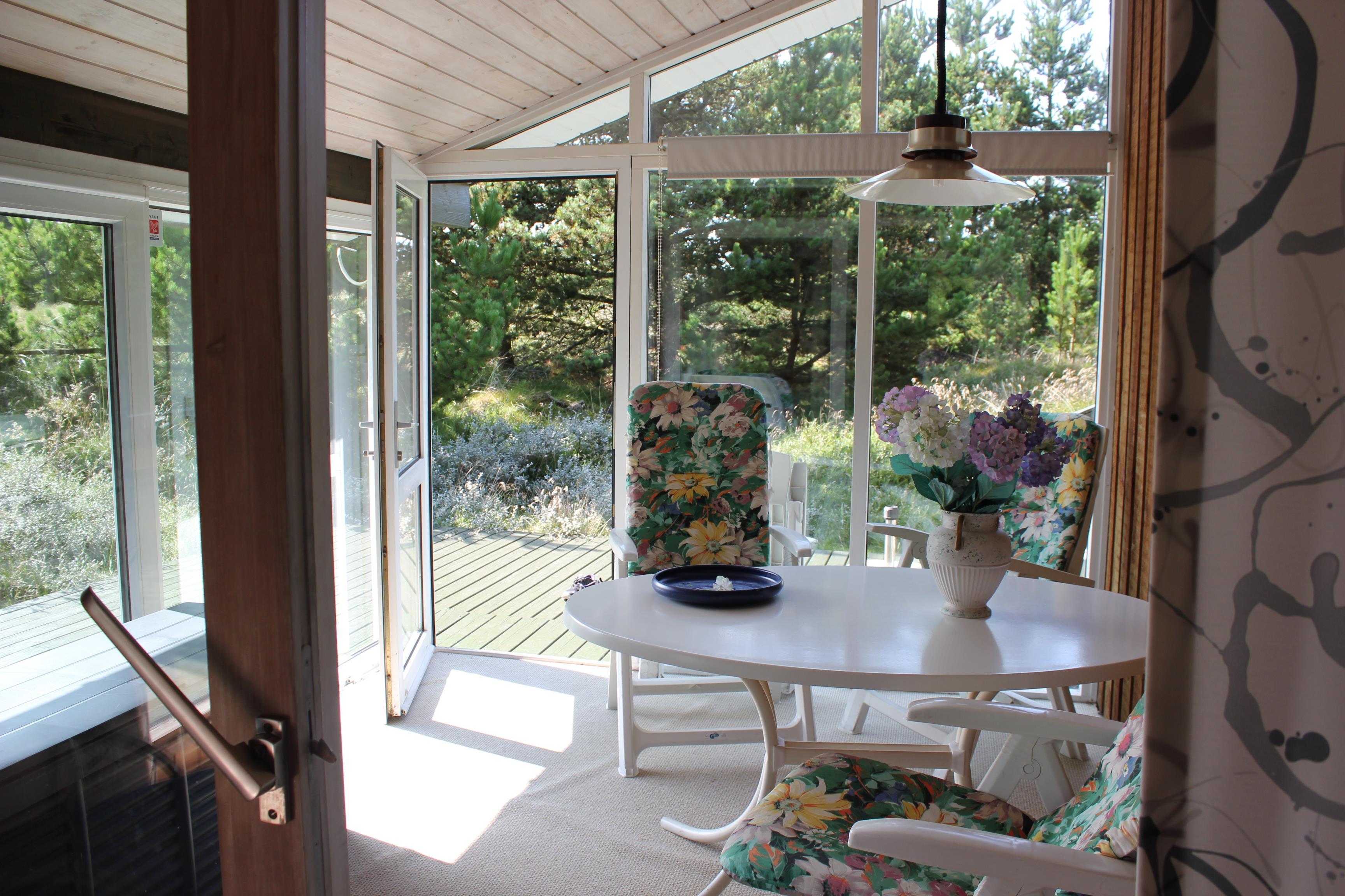 Dieses Haus liegt auf einem Grundstück, das mit Strandhafer, Heidekraut und Bäumen bewachsen ist. Es liegt in einem schönen Ferienhausgebiet, das Ruhe und Zeit für Entspannung ausstrahlt. Das Haus ist an 3 Seiten von einer Terrasse umgeben, von der die Seite, auf die die Haupteingangstür hinausgeht, überdacht ist. Auf den anderen beiden Seiten ist die Terrasse wunderbar geräumig und von aussen nicht einsehbar. Hier kann man viele Stunden verbringen, indem man z. B. die schöne Sonne geniesst oder mit einem Familienspiel an dem grossen Gartentisch sitzt. Von der Terrasse gegenüber dem Haupteingang führt eine Tür in einen schönen hellen Wintergarten, in dem man es sich gemütlich machen kann, ganz gleich, welches Wetter Dänemark gerade anbietet.