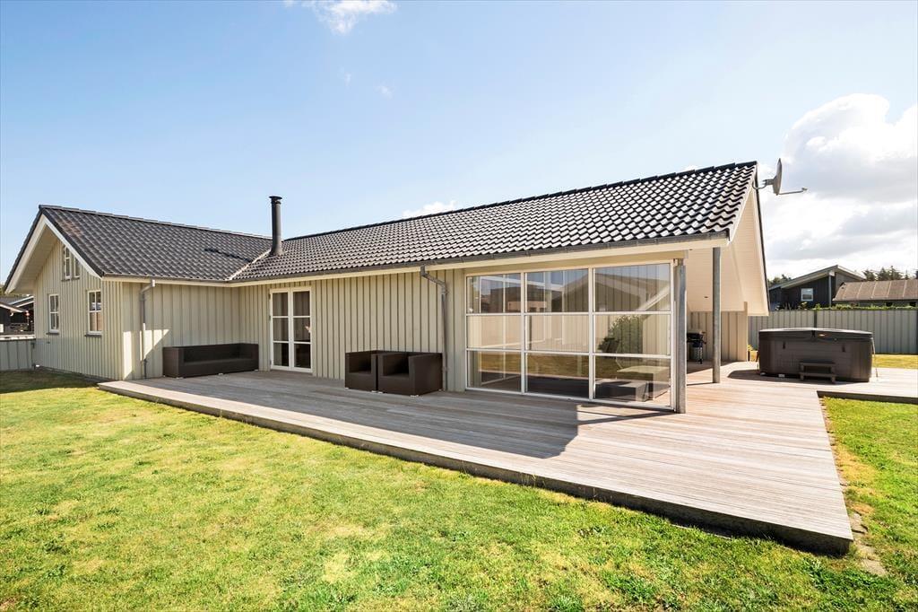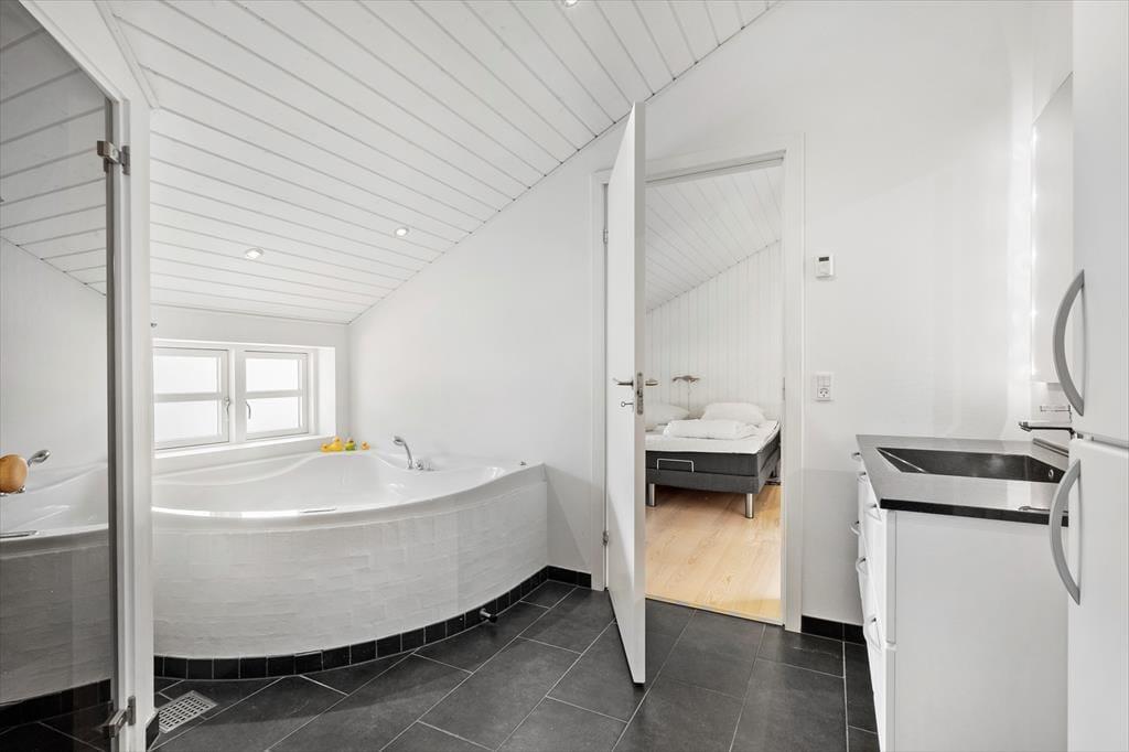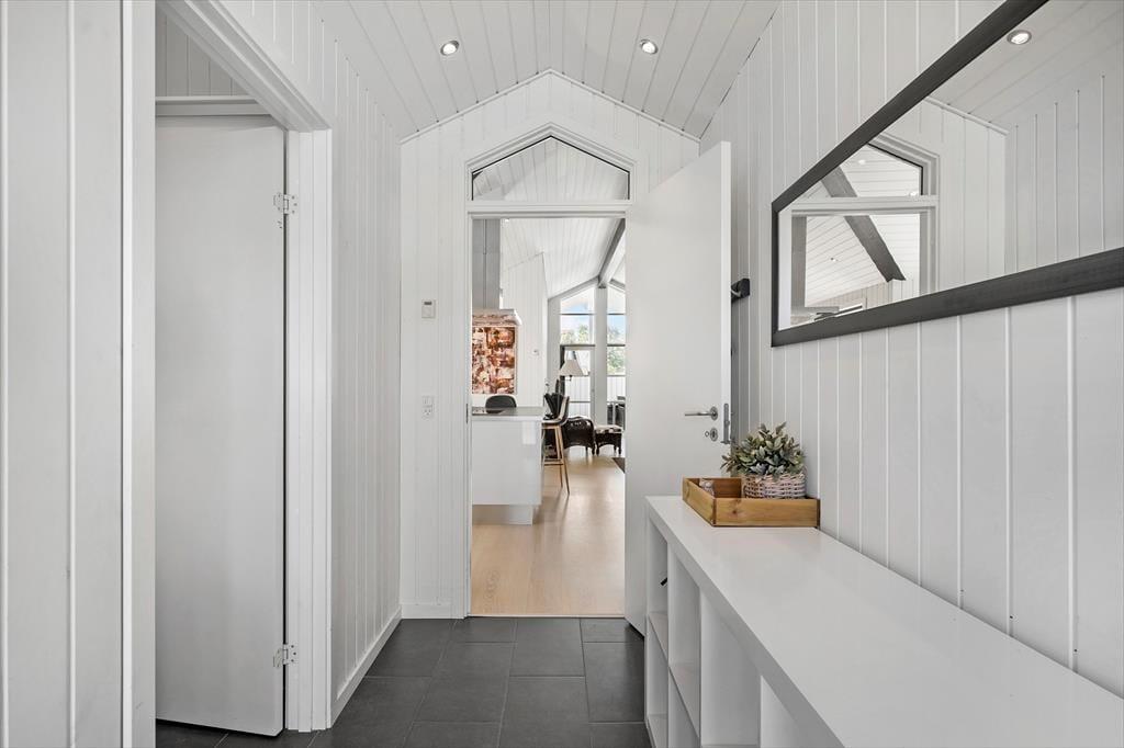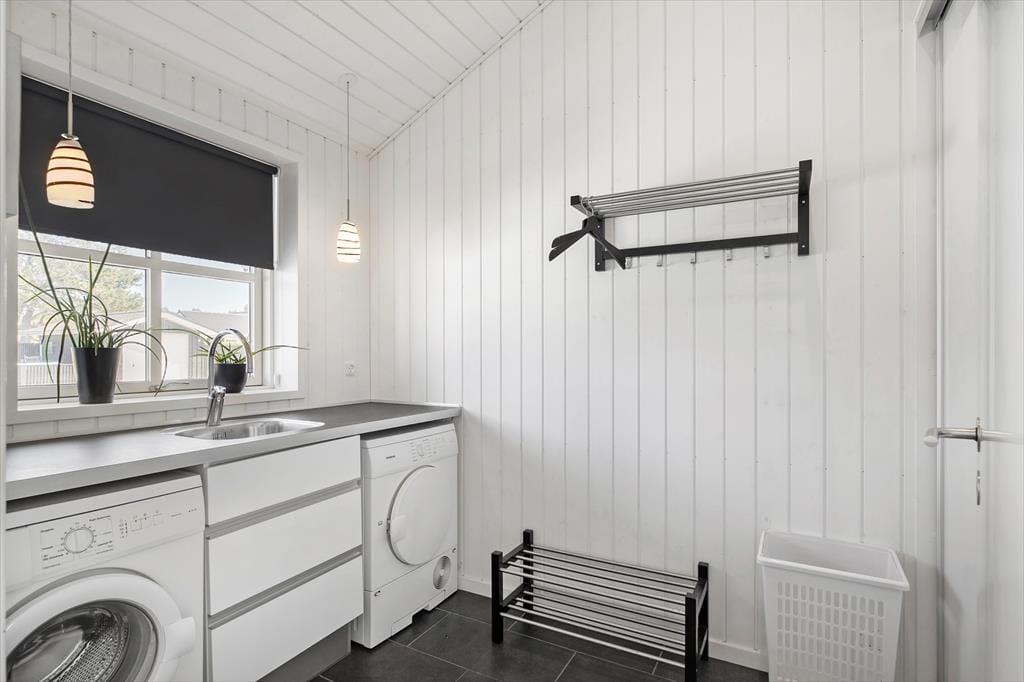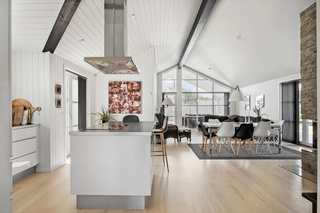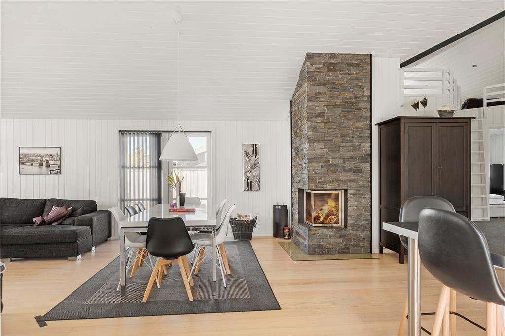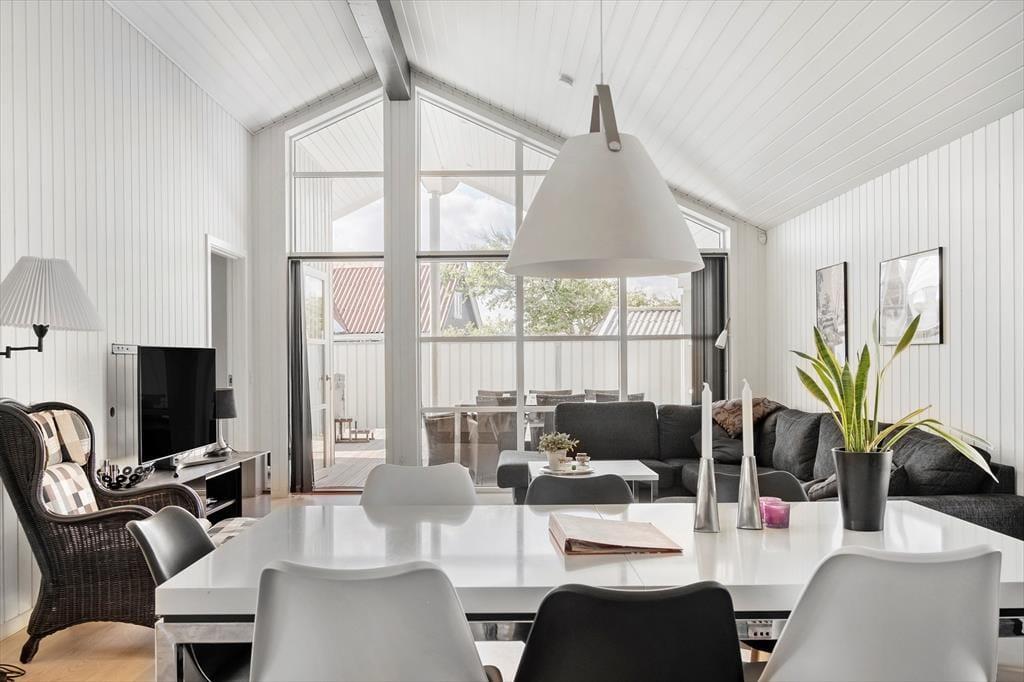 Im Ferienhaus gibt es überall hohe Decken, weiße Holzwände und große Fensterpartien, das alles in allem für eine schöne und gemütliche Atmosphäre sorgt. Die vielen qualitativ hochwertigen Möbeln und abgestimmten Farben in allen Räumen ergeben einen gut durchdachten und umgesetzten Stil. In der Küche haben Sie Platz für gemeinsame Kochabende. Im Badezimmer können Sie in der Sauna entspannen und im Wohnzimmer empfängt der Fernseher dänische, deutsche, norwegische und schwedische Sender. Außerdem können Sie die Wärme des tollen aus Stein gemauerten Kamins genießen und bringen Sie Ihren Laptop oder Tablet-PC mit, um das kostenlose WLAN zu nutzen. Im Hauswirtschaftsraum sind Waschmaschine und Trockner vorhanden.