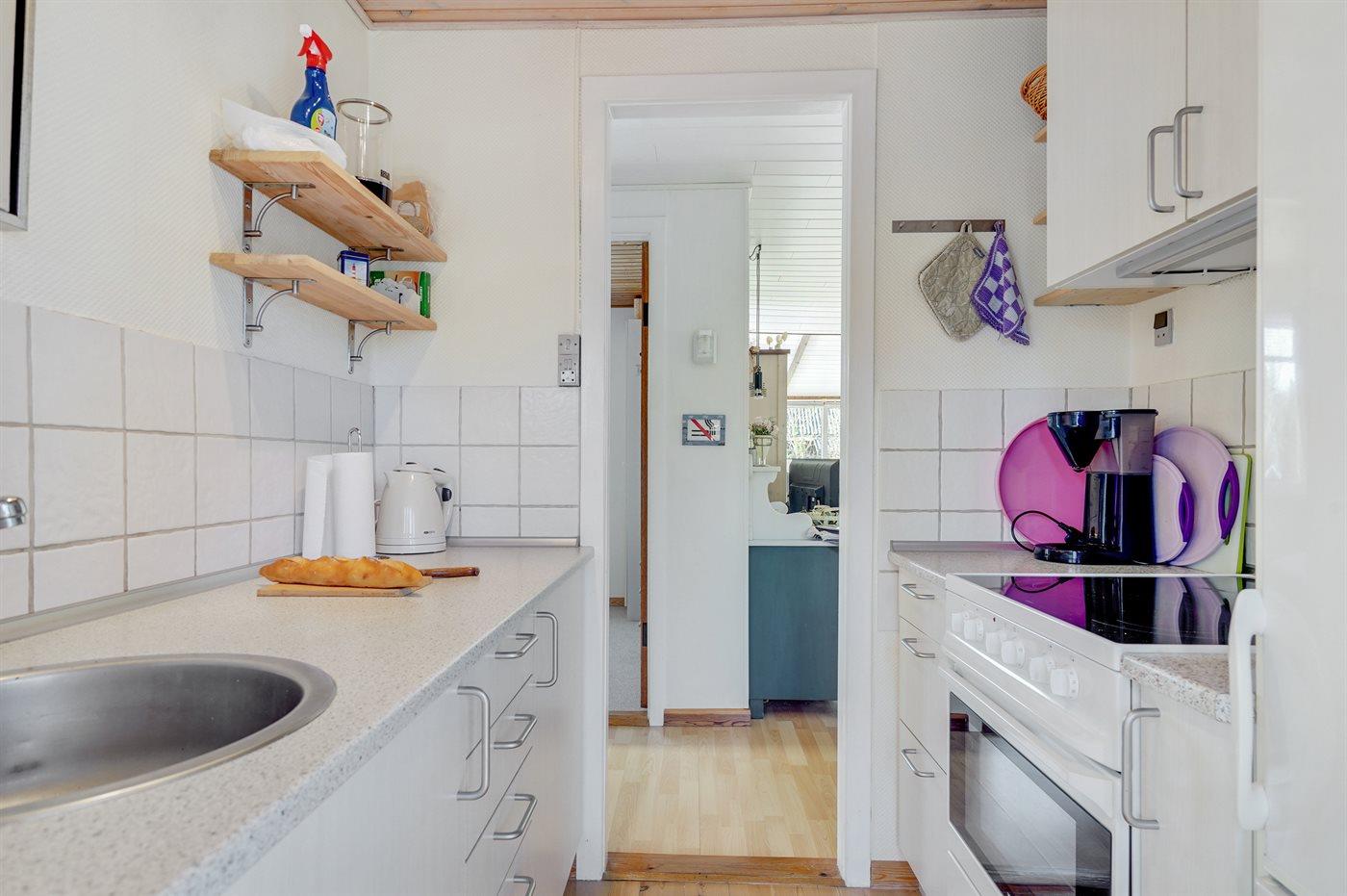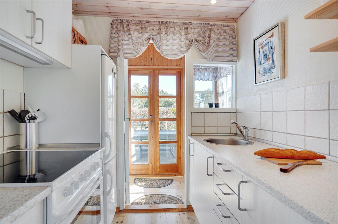 Die Küche ist mit Kühlschrank ausgestattet. Außerdem gibt es 4 Keramik-Kochfelder, Backofen.