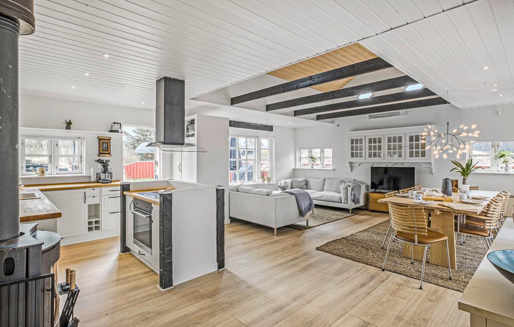 Ihr helles Ferienhaus heißt Sie willkommen und bietet den idealen Rahmen für eine entspannte Auszeit mit der Familie oder Freunden. Genießen Sie die freundliche Atmosphäre, die durch viel Tageslicht und helle Farben unterstrichen wird. Machen Sie es sich in der gemütlichen Sofaecke bequem, wärmen Sie sich am Kaminofen oder kommen Sie für gemeinsame Mahlzeiten am großen Esstisch zusammen. Bereiten Sie in der offen gestalteten Küche auch im Urlaub mühelos Ihre Lieblingsgerichte zu.