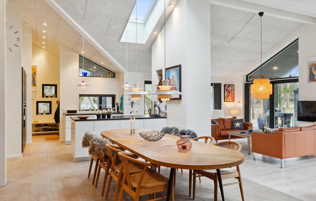 Dieses lichtdurchflutete Haus empfängt Sie mit einem ebenso modernen wie gemütlich Wohn-Ess-Bereich, in dem eleganten Mobiliar, ein Kaminofen und liebevoll ausgesuchte Details eine wohltuende Stimmung schaffen. Schenken Sie sich einen duftenden Kaffee ein, verbringen Sie einen Spielnachmittag am langen Esstisch oder entspannen Sie sich bei wohliger Wärme in der Sauna.
