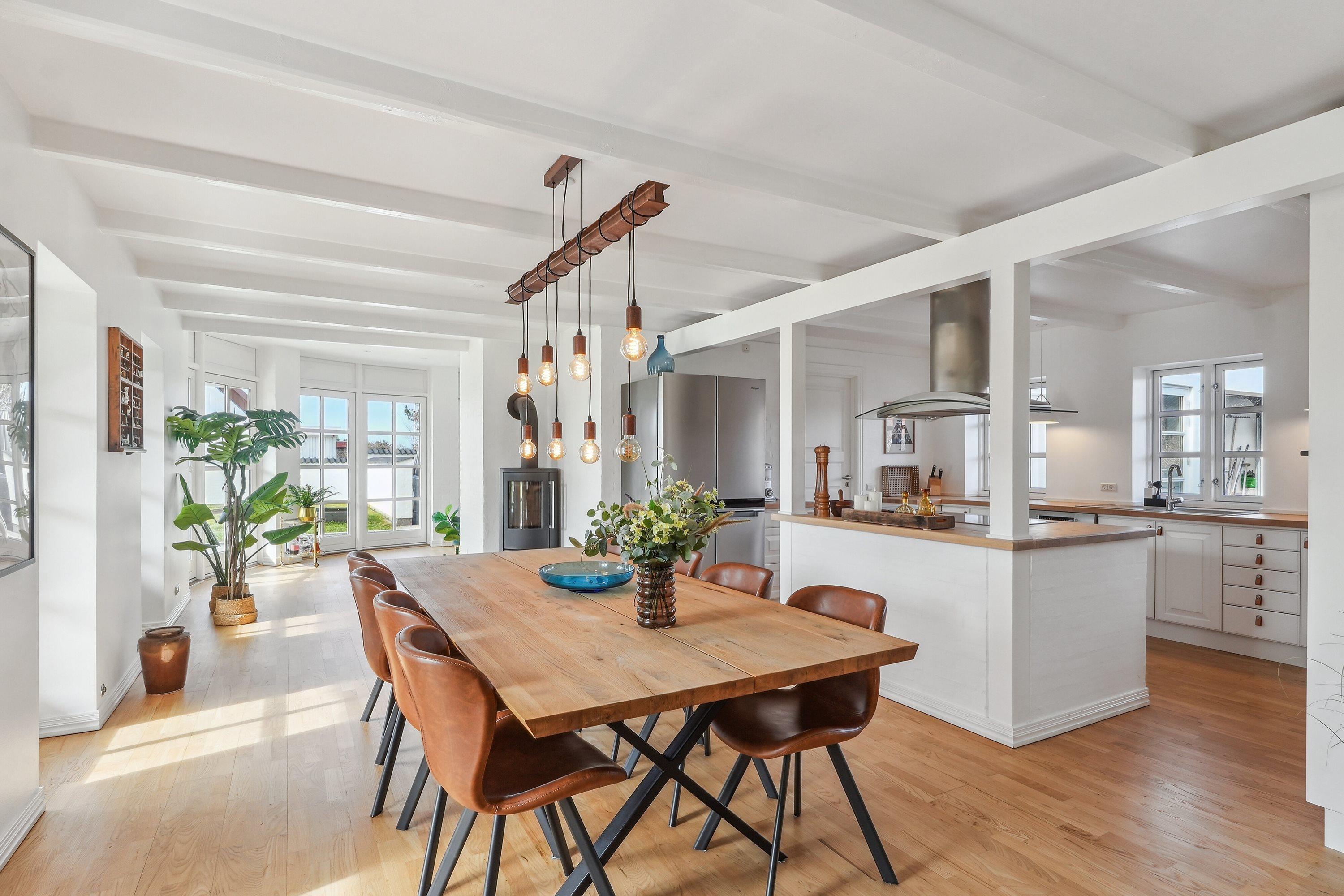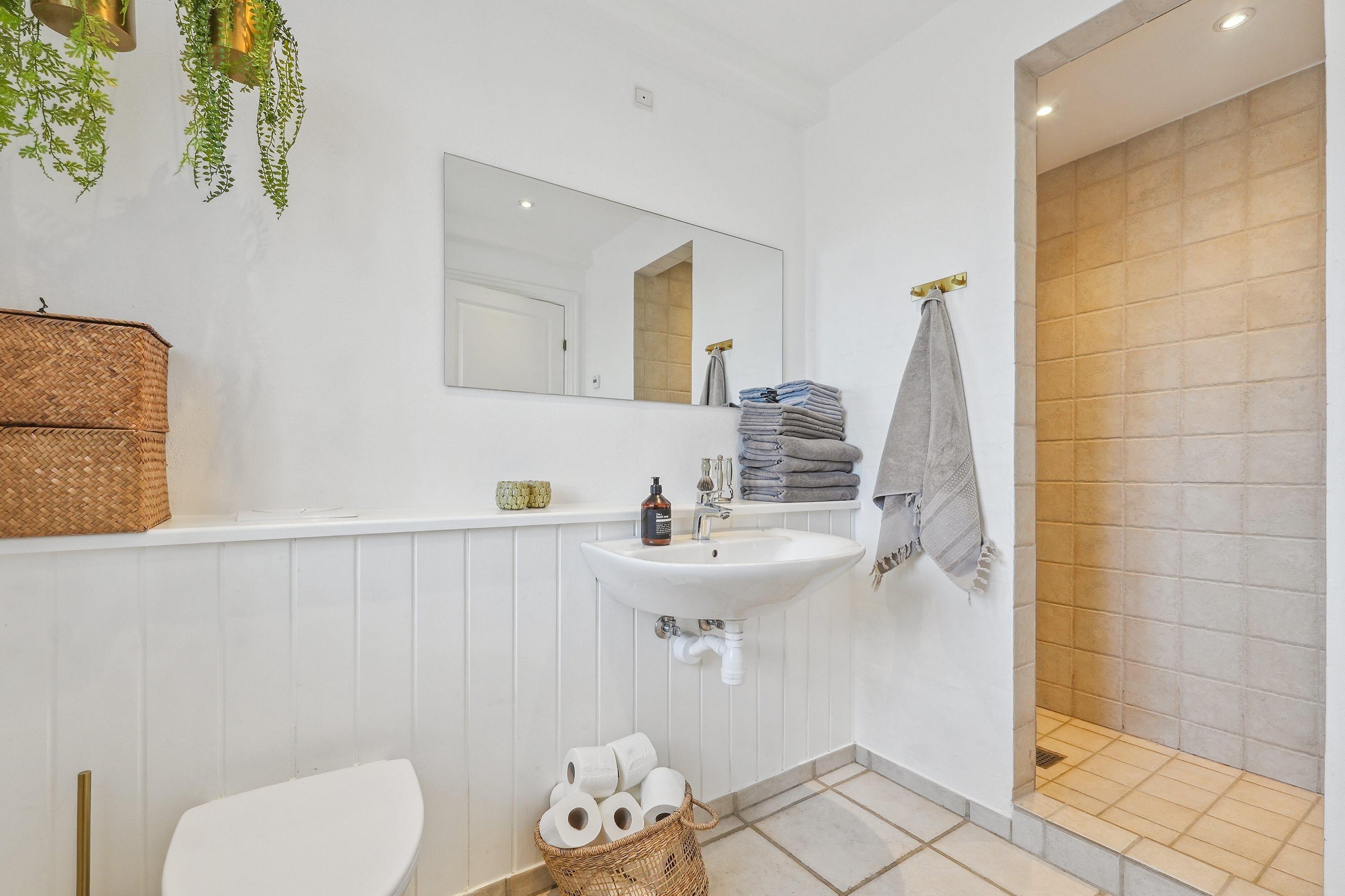 Im Haupthaus betrittst du eine große, helle Diele mit einem Badezimmer zur linken Seite und einer Treppe in das Obergeschoss. Von der Diele gelangst du in die fantastische offene Küche mit Essbereich sowie in die Wohnräume, die das Herz des Hauses bilden. Von hier aus hast du Zugang zum großen Garten und zum Terrassenbereich sowie zu einem zusätzlichen gemütlichen Wohnzimmer mit großer Fensterfront – ideal zum Entspannen und Genießen des Urlaubs. Im Obergeschoss des Haupthauses befinden sich ein weiteres Badezimmer sowie drei Schlafzimmer mit zwei Doppelbetten und zwei Einzelbetten, außerdem ein Flur und ein begehbarer Kleiderschrank. Die große Küche ist mit einer Spülmaschine ausgestattet, die Küche im Nebengebäude nicht.