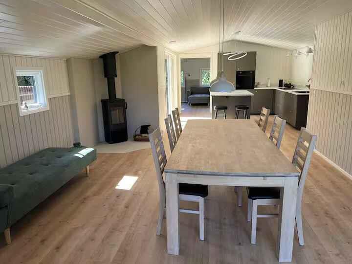 Dieses neu renovierte Ferienhaus eignet sich hervorragend für einen Aufenthalt mit der ganzen Familie. Das Haus ist großzügig gestaltet und bietet sowohl Platz für gemeinsames Beisammensein als auch für Privatsphäre. Große, gut isolierte Schlafzimmer und neue Betten sorgen für hohen Komfort. Das Haus verfügt über 4 große Schlafzimmer mit Doppelbetten. Zusätzlich kann ein Daybed für eine weitere Person genutzt werden. Fußbodenheizung in allen Räumen sorgt für angenehme Wärme, und der Kaminofen schafft zusätzliche Gemütlichkeit. Im Außenbereich gibt es viel Platz, um den Urlaub zu genießen. Die große Holzterrasse mit 85 m² eignet sich ideal zum Entspannen, Essen und Zusammensein. Überdachte Bereiche sowie Terrassen nach Süden, Westen und Norden bieten Sonne und Schutz rund um die Uhr. Das große Grundstück lädt zum Spielen und Entdecken ein. Spiele und Grill stehen für gemütliche Stunden bereit. Die Umgebung bietet attraktive Urlaubsmöglichkeiten. Das Ferienhaus liegt in der Nähe von Strand und Stadt und bietet Zugang zu Mountainbike-Strecken und einem Gateway. Die Region eignet sich sowohl für aktive Erlebnisse als auch für ruhige Spaziergänge.