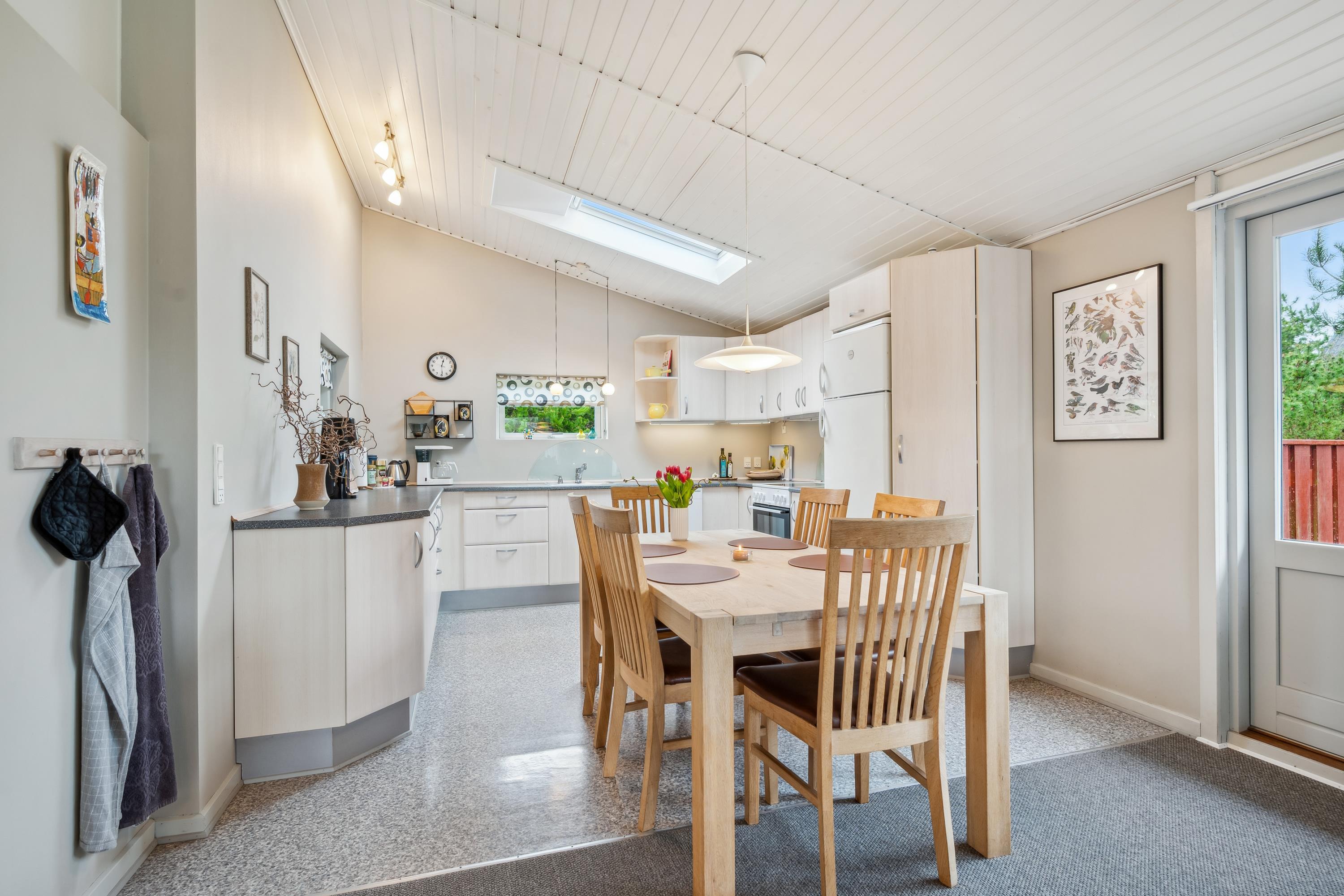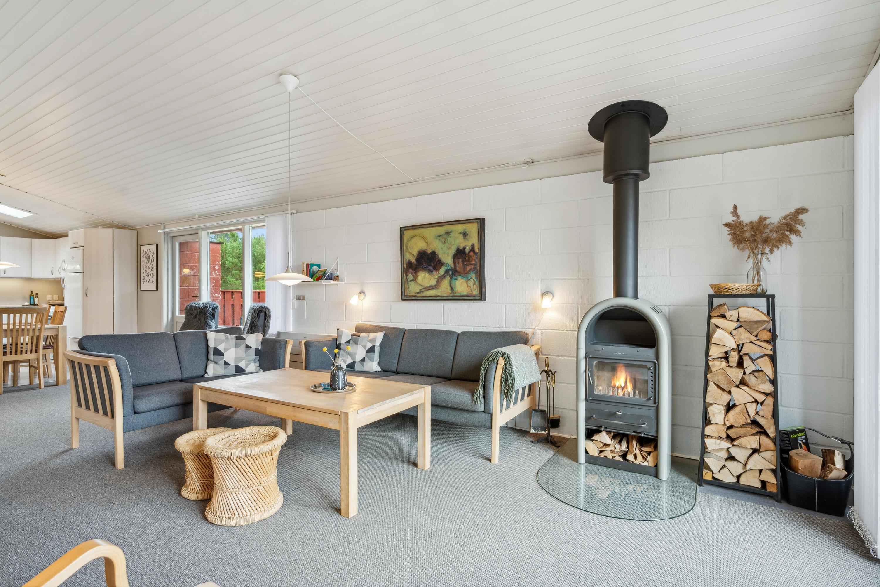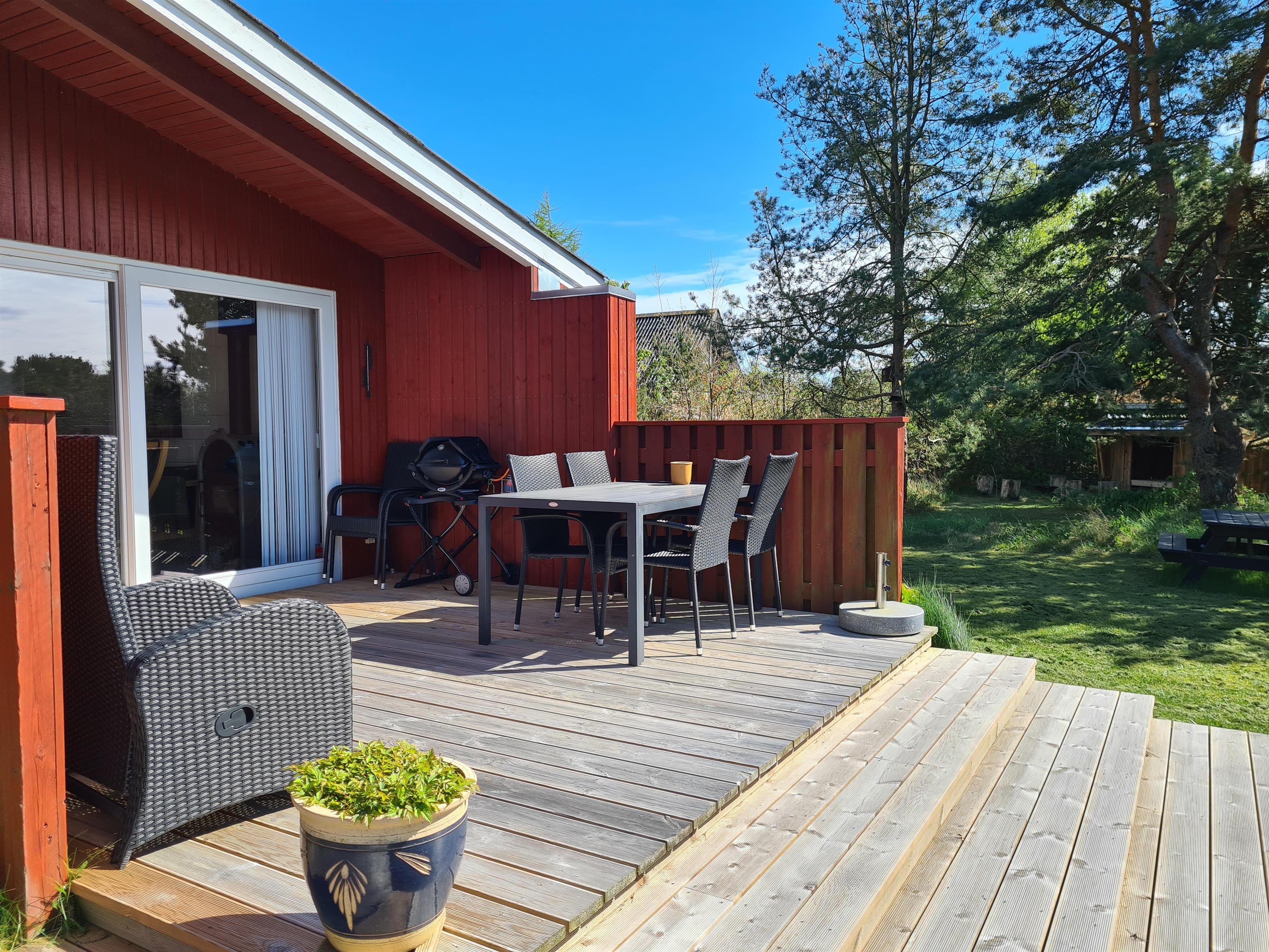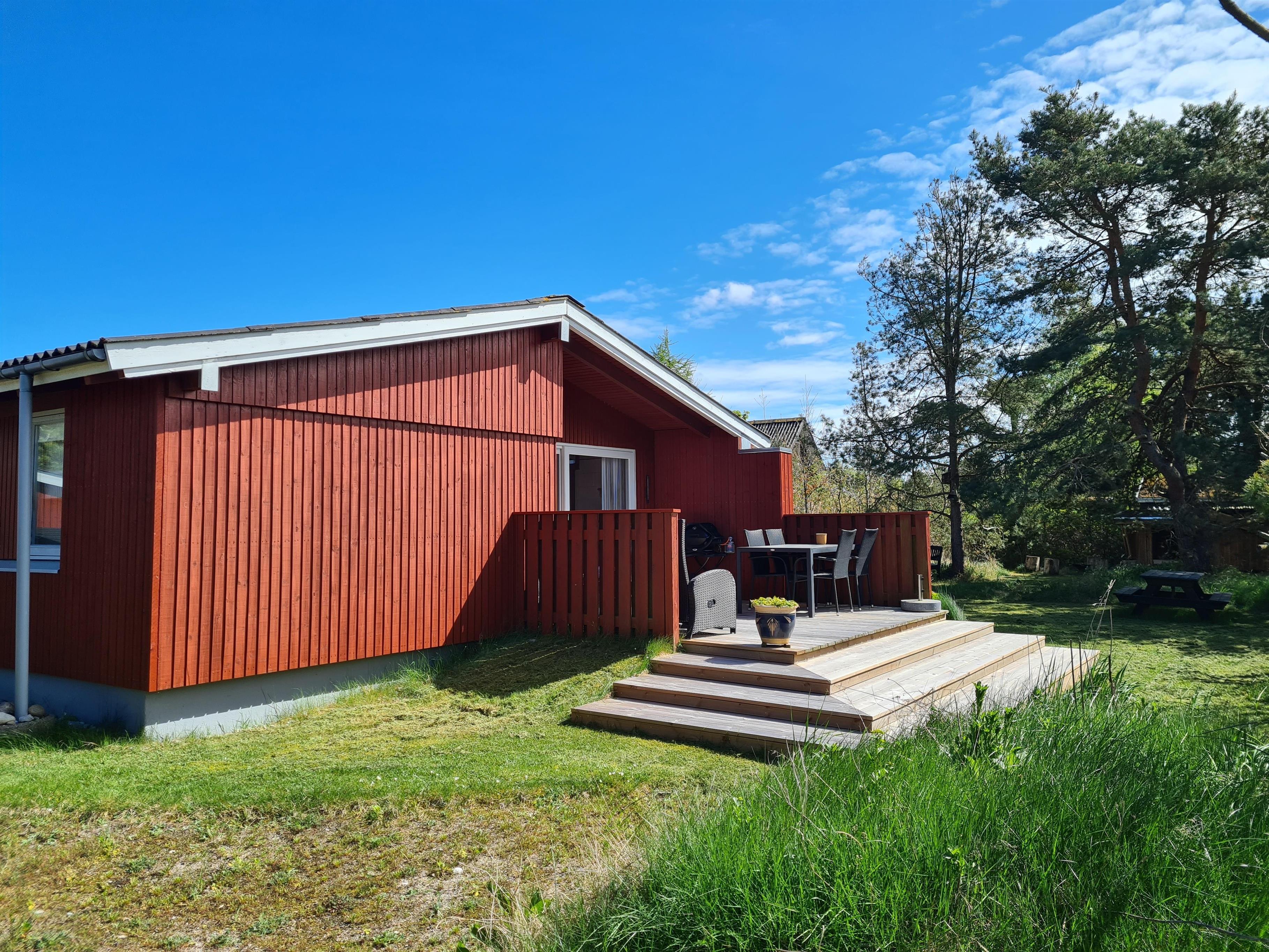 Dieses Ferienhaus liegt in schöner Umgebung in Strandnähe und auf einem schönen Naturgrund mit Bäumen und Büschen und teilweise überdachter Terrasse mit Gartenmöbeln und Grill. Gemütliches Wohnzimmer mit Holzofen, TV mit SAT-Anlage und Stereoanlage mit CD. Küche mit Elektroherd, Kühlschrank mit kleinem Gefrierfach und Geschirrspüler. Badezimmer mit Dusche. Die Schlafplätze verteilen sich auf 3 Schlafzimmer: 2 mit Einzelbetten und 1 Bett 120X200. Für die kleinen Feriengäste finden Sie Kinderbett und Kinderhochstuhl. Carport.
