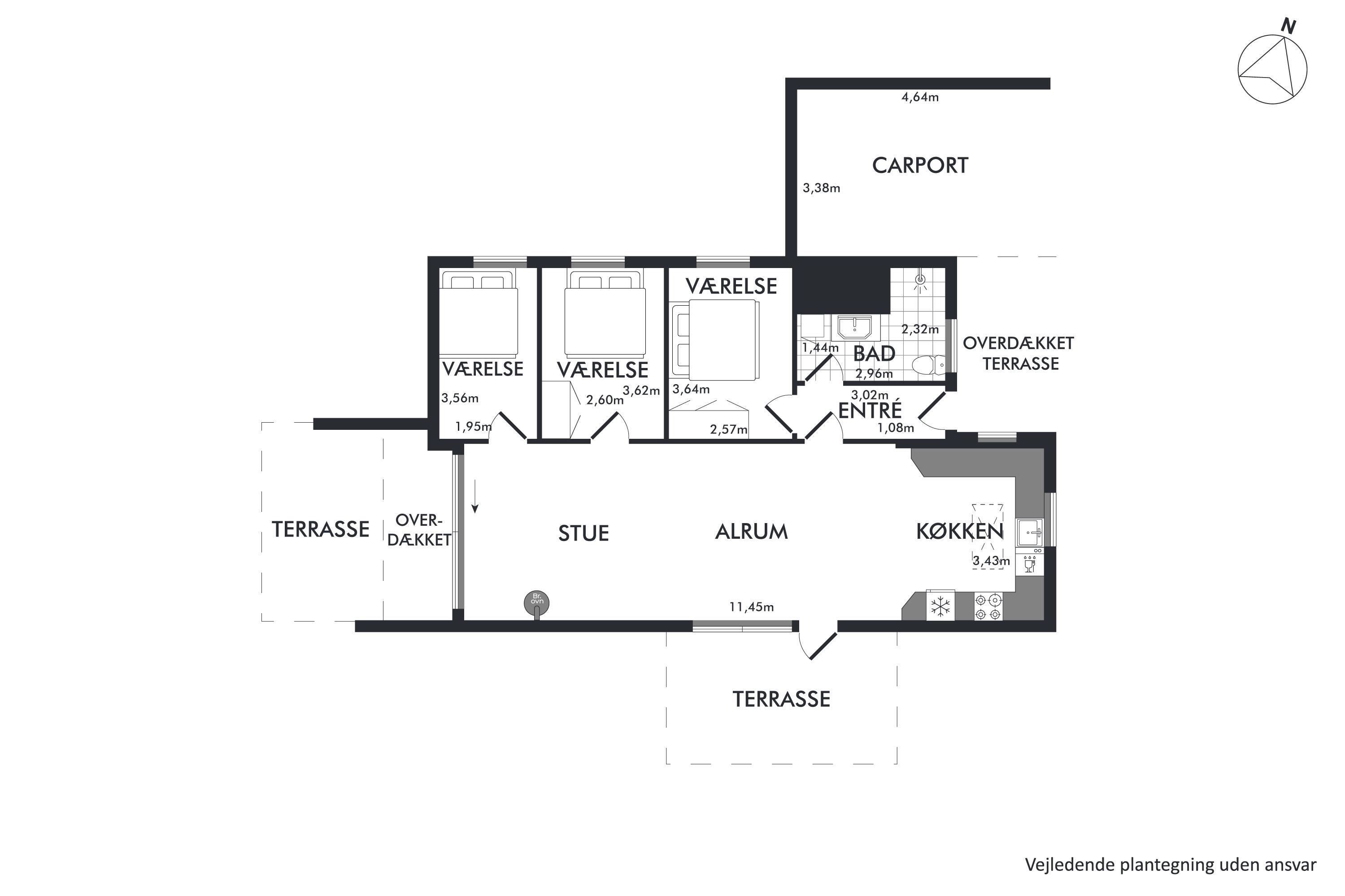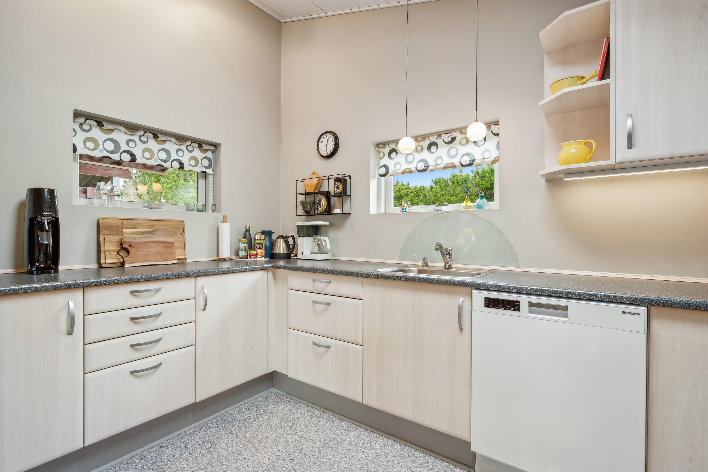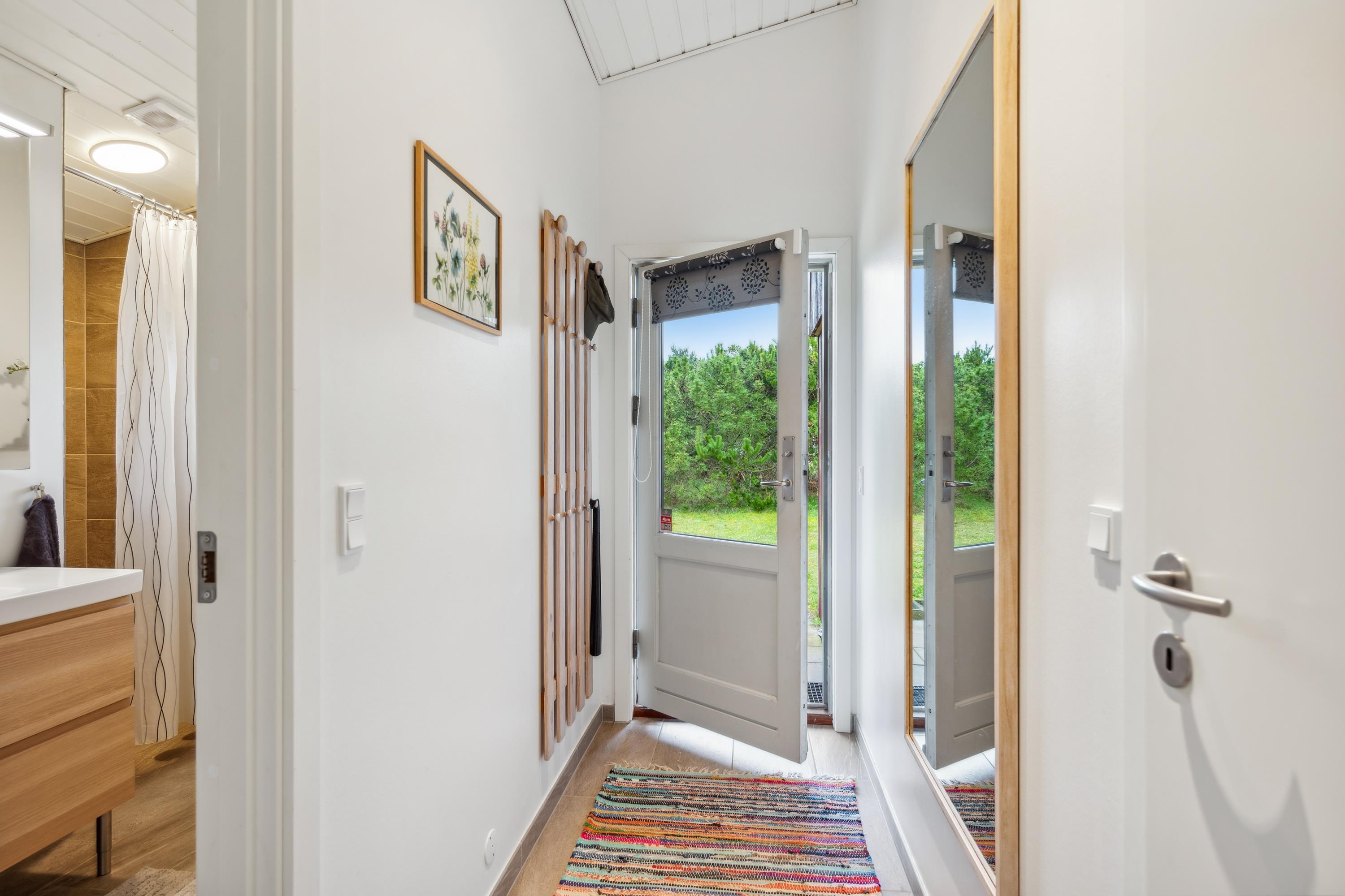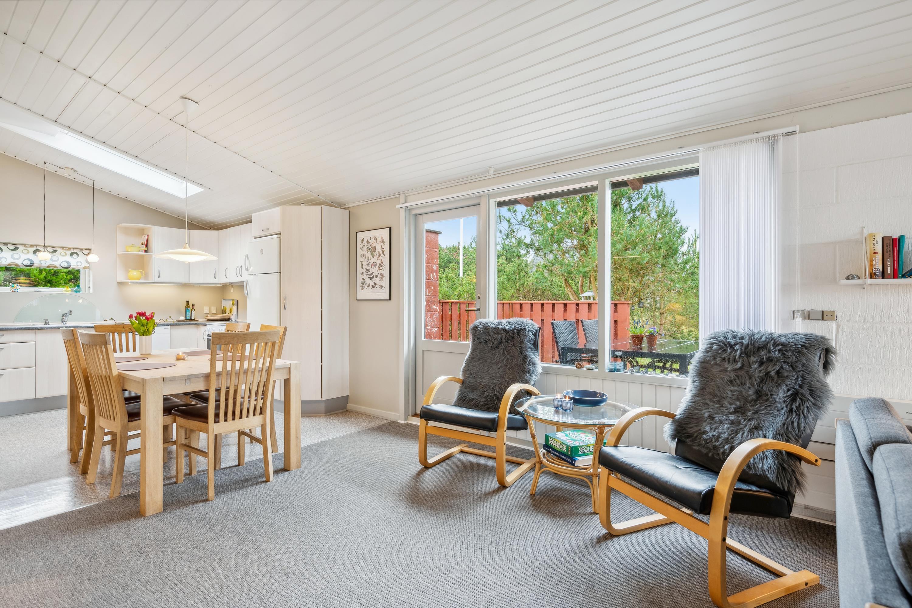 Dieses Ferienhaus liegt in schöner Umgebung in Strandnähe und auf einem schönen Naturgrund mit Bäumen und Büschen und teilweise überdachter Terrasse mit Gartenmöbeln und Grill. Gemütliches Wohnzimmer mit Holzofen, TV mit SAT-Anlage und Stereoanlage mit CD. Küche mit Elektroherd, Kühlschrank mit kleinem Gefrierfach und Geschirrspüler. Badezimmer mit Dusche. Die Schlafplätze verteilen sich auf 3 Schlafzimmer: 2 mit Einzelbetten und 1 Bett 120X200. Für die kleinen Feriengäste finden Sie Kinderbett und Kinderhochstuhl. Carport.