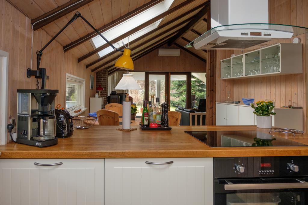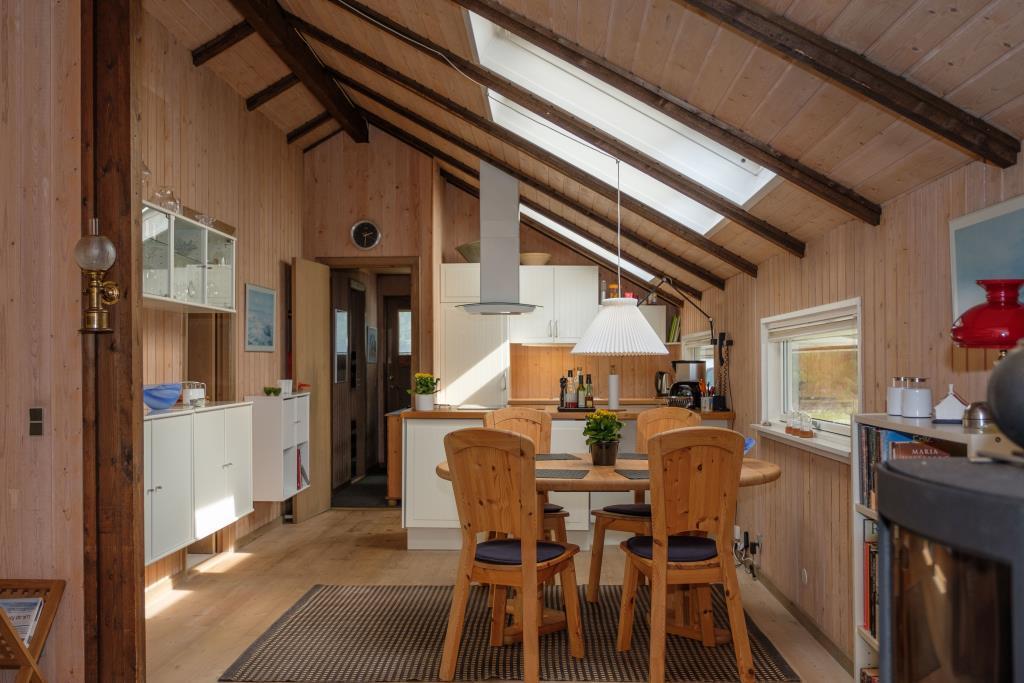 Das Ferienhaus wirkt gut eingerichtet und geräumig mit gewölbten Decken. Gemütliches Wohnzimmer mit Zugang zur Terrasse, Holzofen, TV mit Chromecast nutzbar und es gibt deutsche Sender und Radio. Schöne Wohnküche mit Dachfenstern, Essbereich für 6 Personen und neuerer Küche mit Cerankochfeld, Backofen, Geschirrspüler sowie Kühl- und Gefrierschrank. Badezimmer mit Dusche. Die Betten sind auf 3 kleine Schlafzimmer aufgeteilt: 2 mit Doppelbett und 1 mit ausziehbares Schlafsofa (120x200). Im Anbau gibt es außerdem eine Waschmaschine und einen Trockner sowie einen zusätzlichen Gefrierschrank. Wlan ist vorhanden.