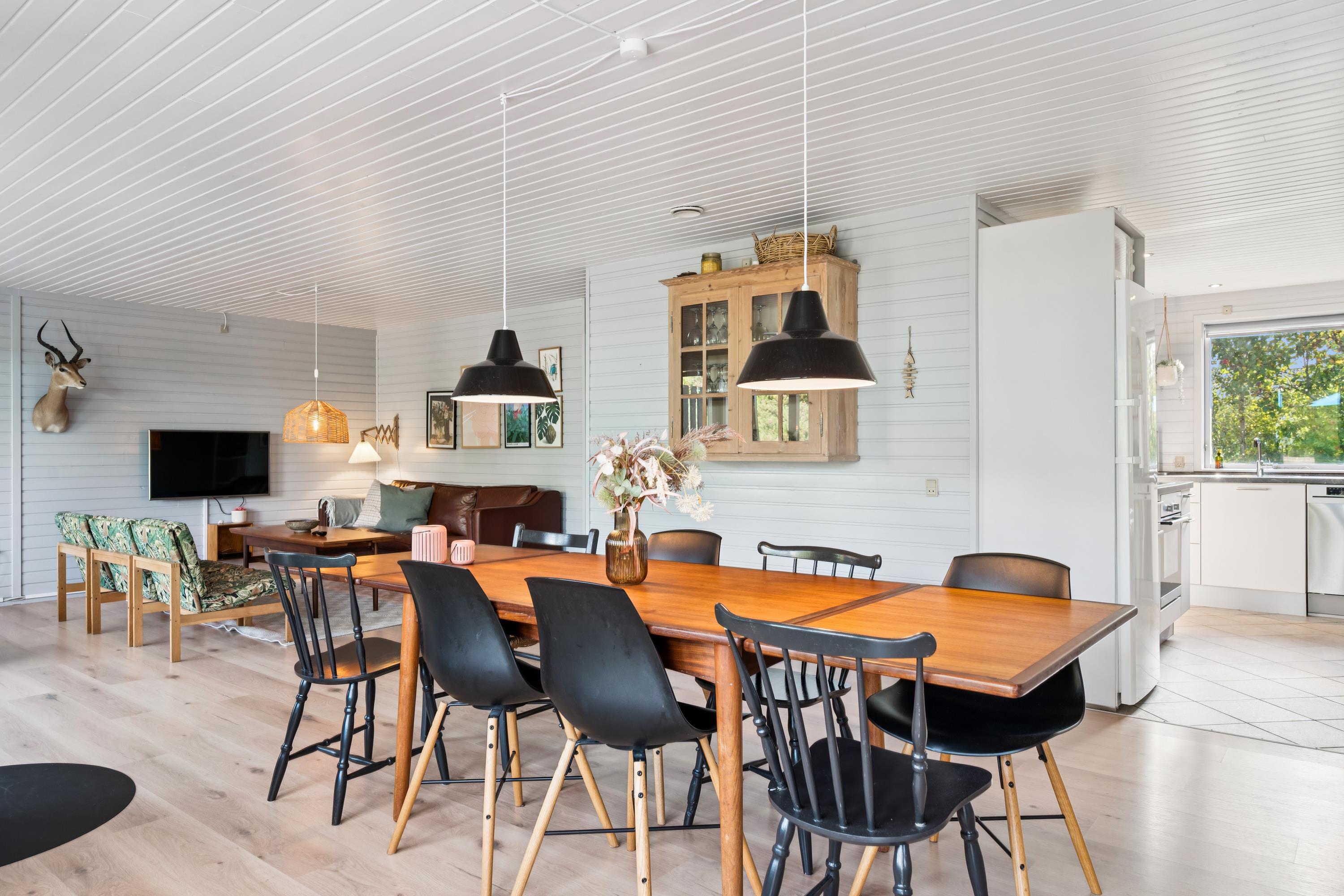 In einem schönen Gebiet und nur eine kurze Fahrt von Ebeltoft entfernt liegt dieses Ferienhaus auf einem großen Naturgrundstück mit einer überdachten Terrasse und einer offenen Terrasse mit Gartenmöbeln und Grill. Gemütliches Wohnzimmer mit Stereoanlage mit CD, DVD, Holzofen, TV mit Parabol und Wärmepumpe mit Aircondition. Küche mit Elektroherd, Kühlschrank und Gefrierfach. Helles Badezimmer mit Dusche. Die Schlafplätze verteilen sich auf 4 Schlafzimmer: 2 mit Doppelbett (ein Schlafzimmer mit Latexmatratzen) und 2 mit Etagenbetten. Für die kleinen Feriengäste finden Sie Kinderbett, Kinderhochstuhl, Schaukel und Sandkasten. WLAN.