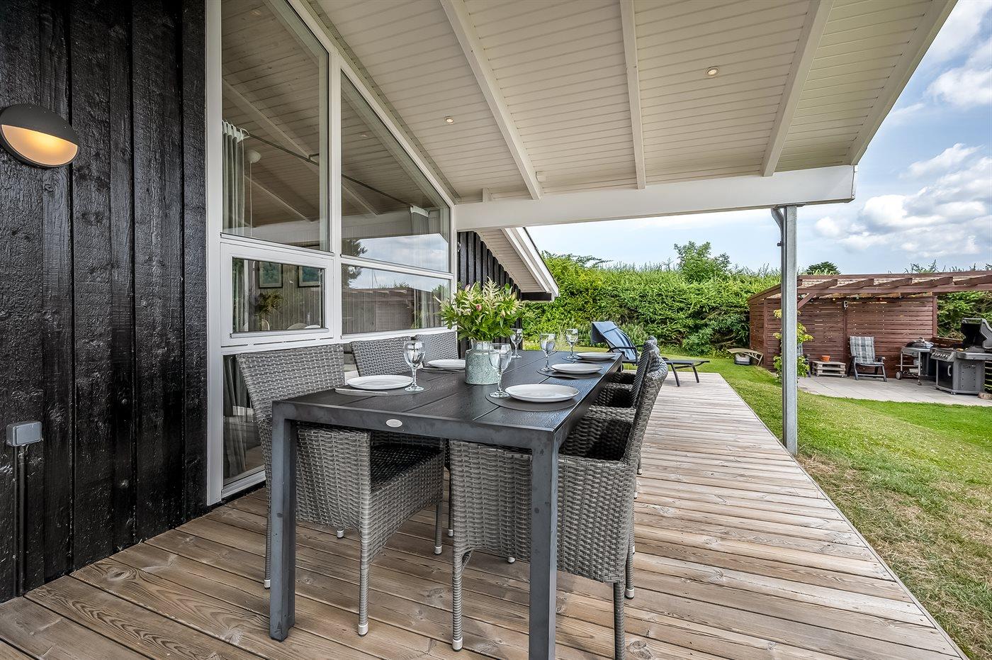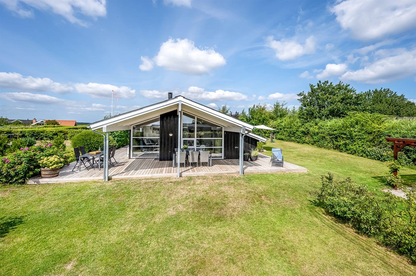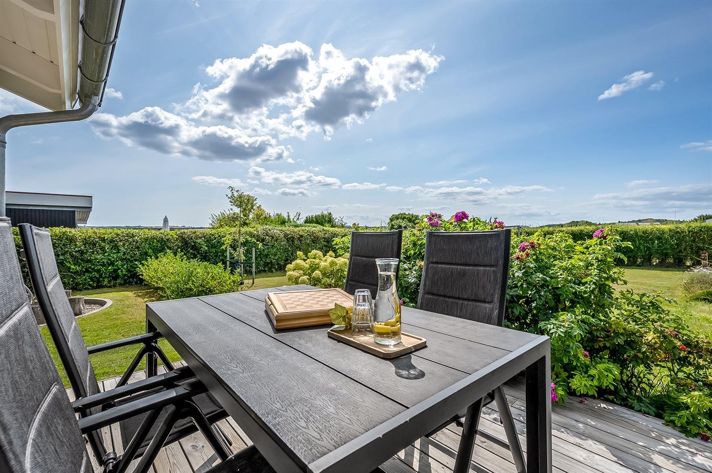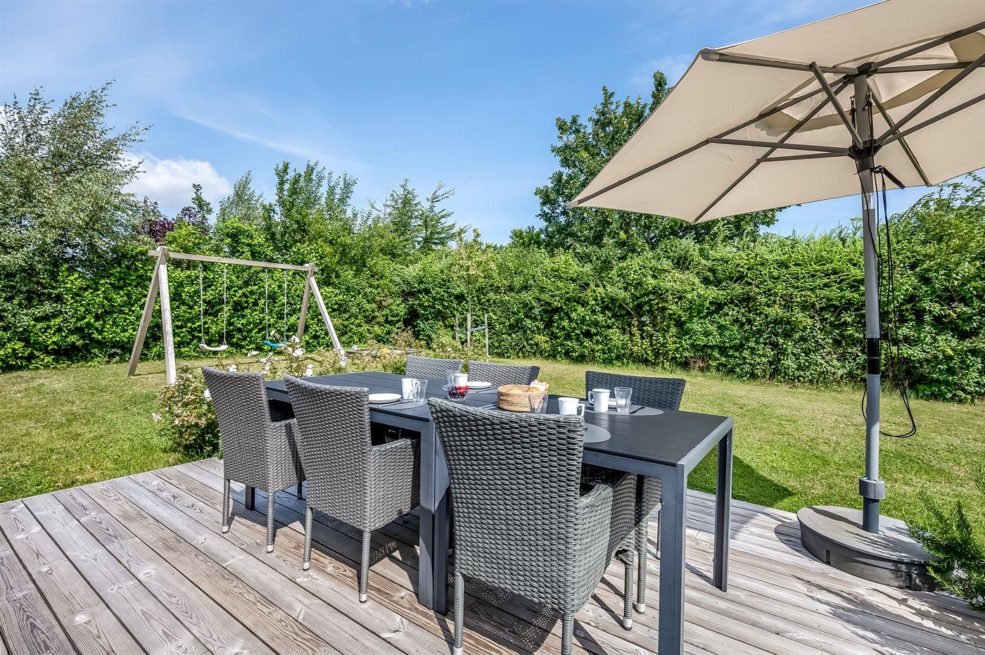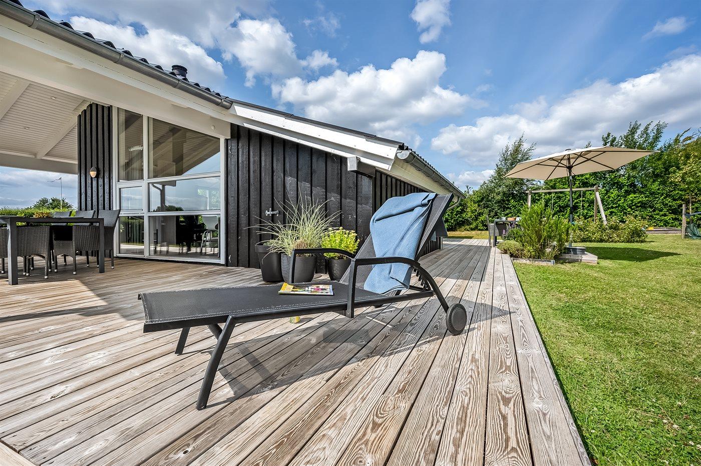 Modernes Ferienhaus nahe Boeslum Strand mit großer Terrasse, Garten und Elektroauto-Ladestation.
