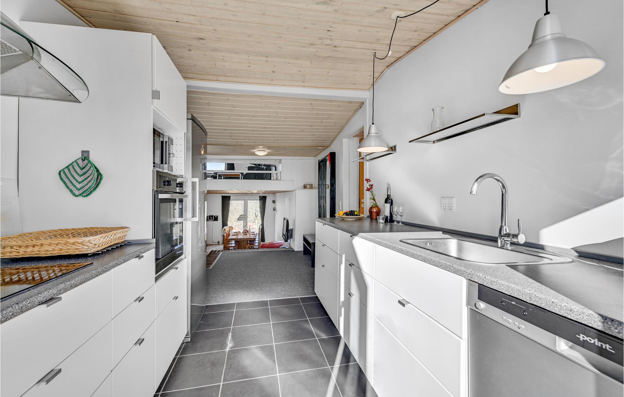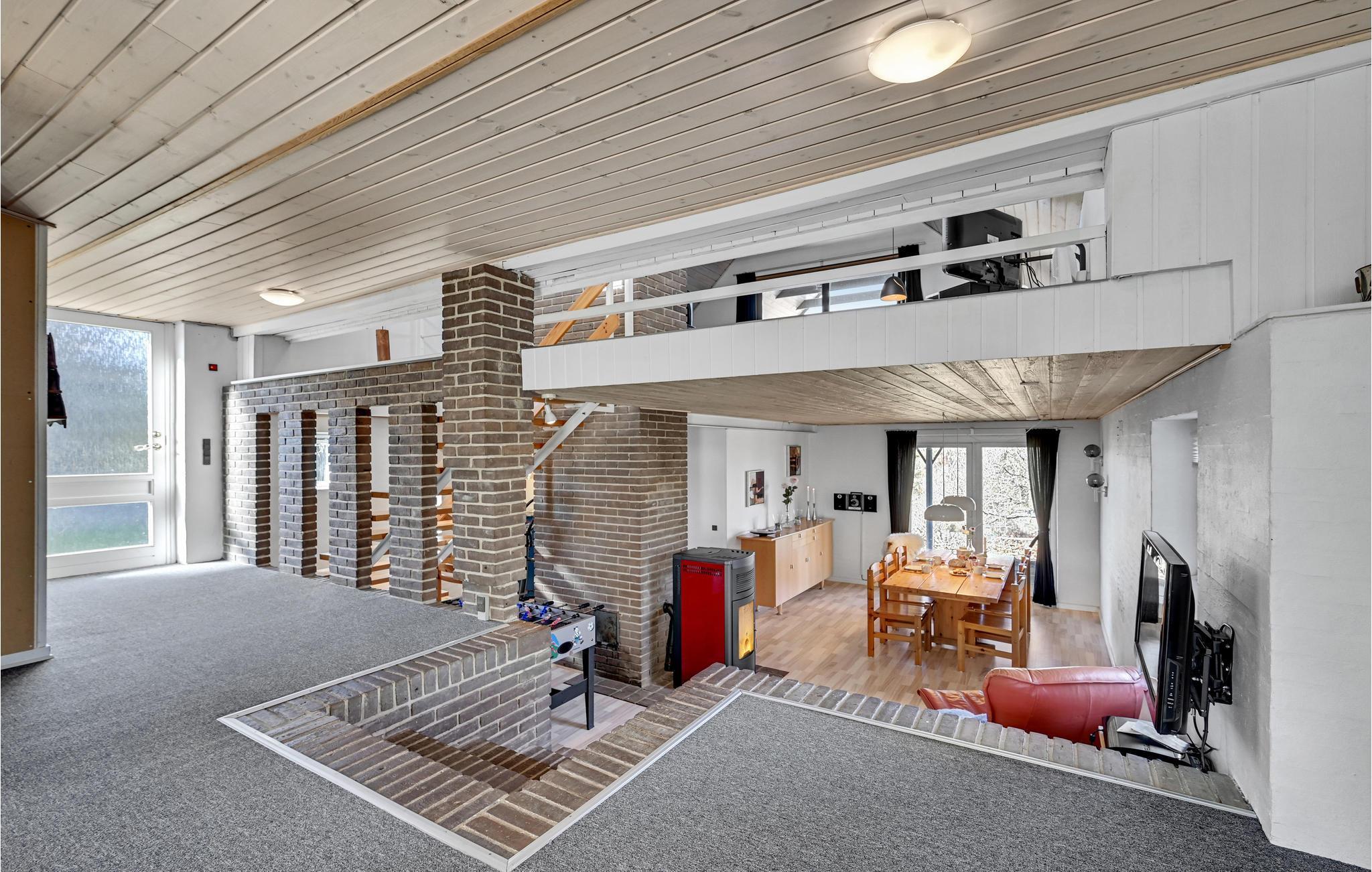 Dieses gemütliche Ferienhaus bietet mit 3 Schlafzimmern 8 Gästen Platz, die sich hier eine schöne gemeinsame Zeit machen können. Die Räume erstrecken sich über 2 Etagen und zum Esszimmer führen 4 Stufen hinunter. Die Küche ist zum Esszimmer hin offen. Es gibt einen Pelletofen und eine Kaminofen, so dass Sie es sich an kühleren Abenden gemütlich machen können.
