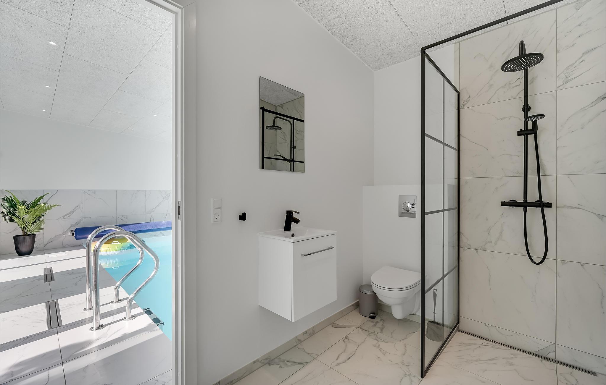 Das komfortable Haus verfügt über zwei Etagen und einem separaten Gebäude, in dem sich ein exklusiver Wellnessbereich mit Pool – sowie Whirlpool und Sauna auf einer Terrasse befindet. Im Wellnessbereich können Sie schwimmen und im Pool spielen, danach im eleganten Whirlpool mit Platz für 4-6 Personen entspannen oder einen Saunagang machen.