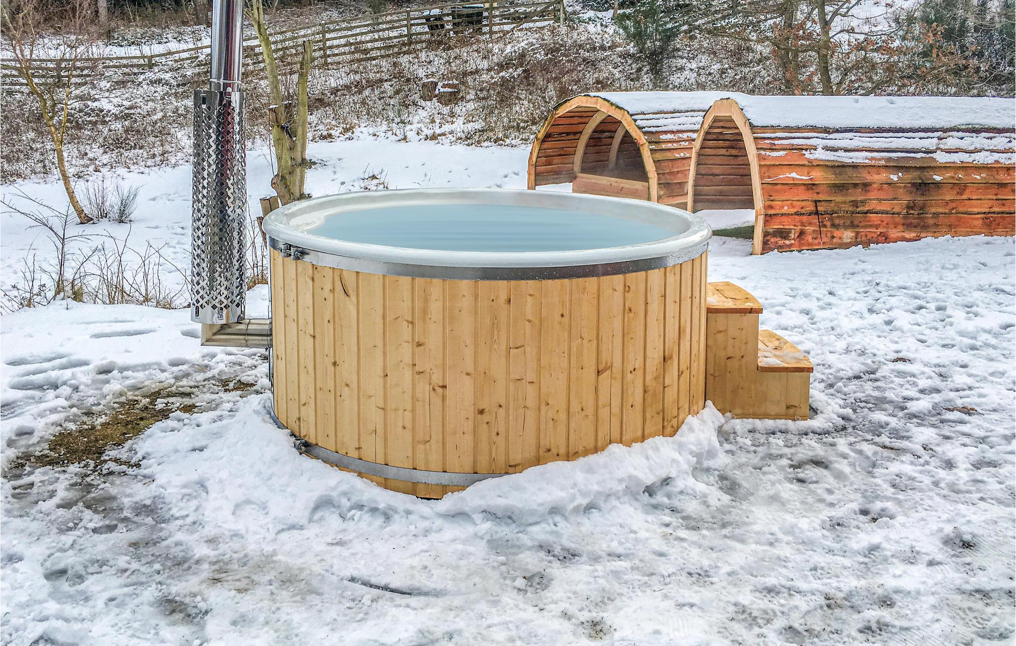 Außergewöhnliche Stunden im Freien bieten zwei Shelters (für diese müssen Sie alles was Sie zum Schlafen brauchen selbst mitbringen) neben einer großen Badetonne.