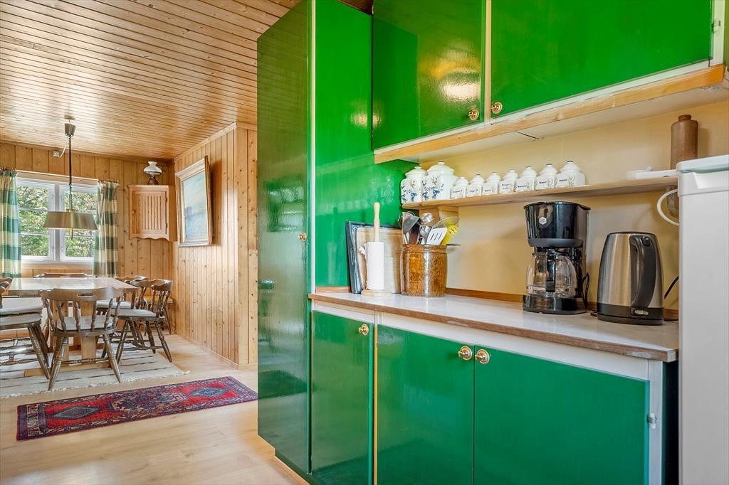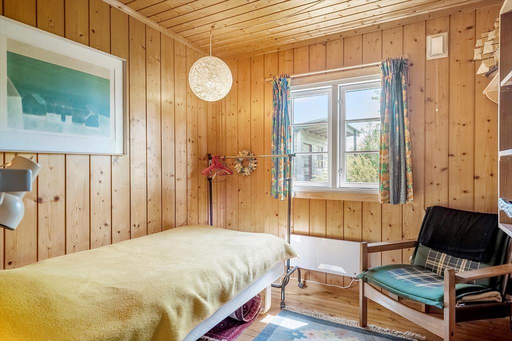 Hier können Sie Ruhe und Frieden einkehren lassen und in den gemütlichen und einladenden Zimmern gemeinsam Ihren Urlaub genießen. Es gibt Platz für 4 Erwachsene und das Haus verfügt über eine Küche mit offener Verbindung zum Wohnzimmer, das mit einer guten Essecke und Sofagruppe sowie einem Fernseher und Wärmepumpe ausgestattet ist. Vom Wohnzimmer aus hat man einen Blick auf die alte Mühle auf Bogø. In der Küche können Sie die Mahlzeiten des Tages zubereiten und diese draußen auf der gemütlichen, überdachten Terrasse genießen. Es gibt 3 Zimmer, 1 mit einem Doppelbett und 2 mit einem Einzelbett. Hier können Sie sich zurückziehen und ein Nickerchen machen oder ein gutes Buch lesen. Das Sommerhaus verfügt über ein gutes und funktionelles Badezimmer mit Toilette, Waschbecken und Dusche, sowie einer von oben bedienbaren Waschmaschine.