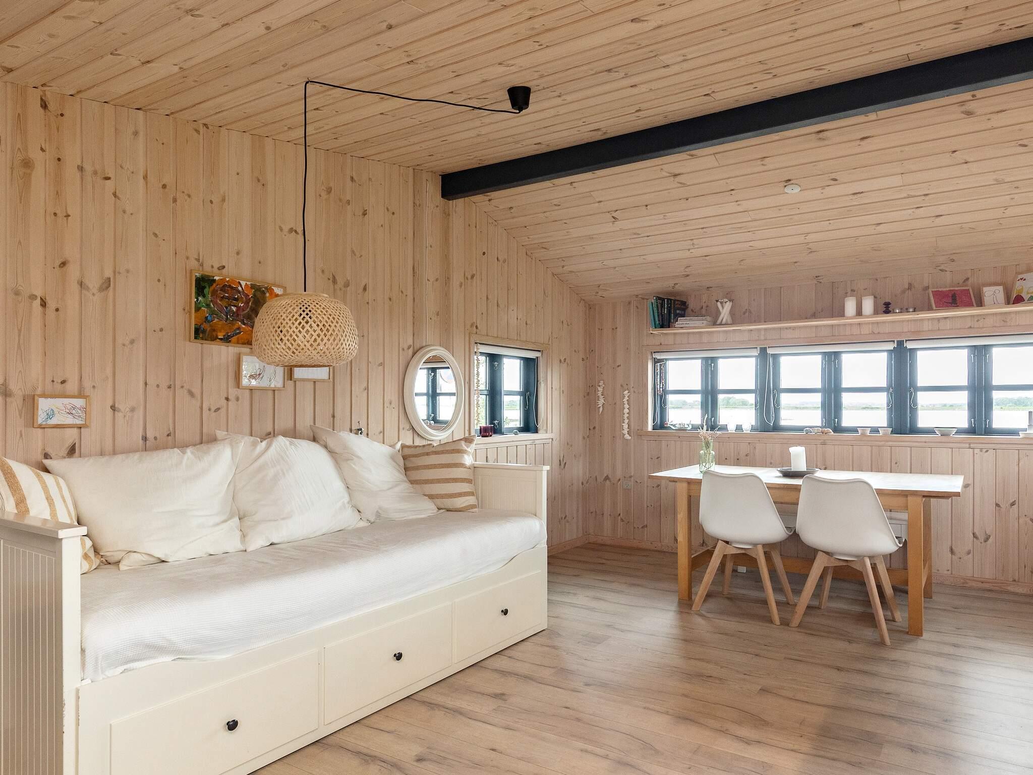 Die Einrichtung ist schlicht, einladend und auf geselliges Beisammensein ausgelegt. Der offene Küchen- und Wohnbereich geht nahtlos in einen Ess- und Sitzbereich über, mit direktem Zugang zur davorliegenden Terrasse. Hier werden Mahlzeiten zu Gesprächen und die Abende lassen mit dem Rauschen der Wellen im Hintergrund ausklingen. Das Wohnzimmer dient gleichzeitig als Schlafbereich mit vier Betten, während die Küche zwei weitere Schlafplätze bietet. So wird es zu einem flexiblen Rückzugsort für Paare, Familien oder kleine Gruppen.