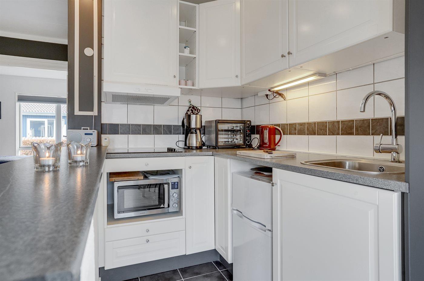 Die Küche ist mit 2 Kühlschränke ausgestattet . Tiefkühlmöglichkeit mit 15 Liter Nutzinhalt. Außerdem gibt es 3 Keramik-Kochfelder, Minibackofen, Mikrowelle.