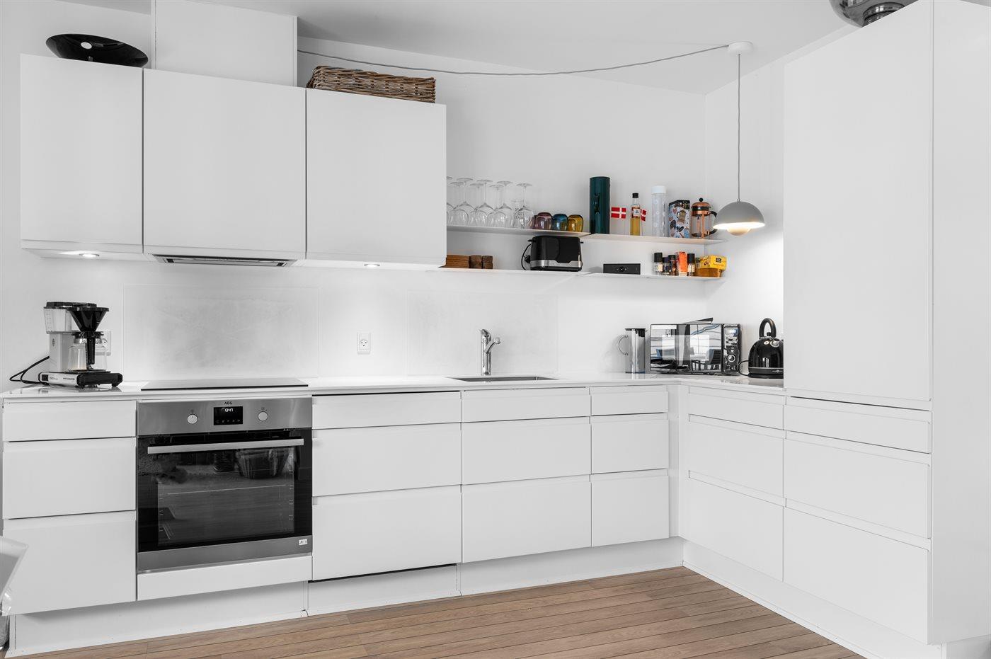 Die Küche ist mit Kühlschrank ausgestattet. Außerdem gibt es 4 Induktions-Kochzonen, Umluftofen, Mikrowelle sowie Geschirrspüler.