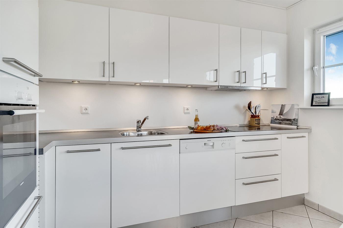 Die Küche ist mit Kühlschrank ausgestattet. Außerdem gibt es 4 Keramik-Kochfelder, Umluftofen, Mikrowelle sowie Geschirrspüler.