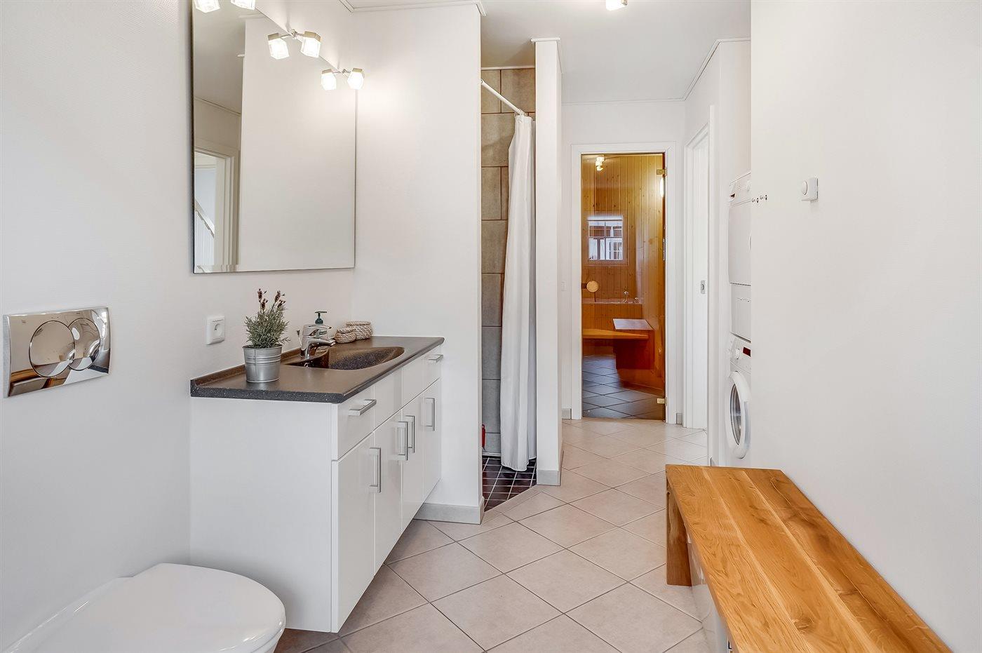 Es gibt 2 Badezimmer mit Duschnische und 2 Toiletten. Fußbodenheizung in 2 Badezimmern. Es steht eine Sauna zur Verfügung in der Sie sich so richtig entspannen können.