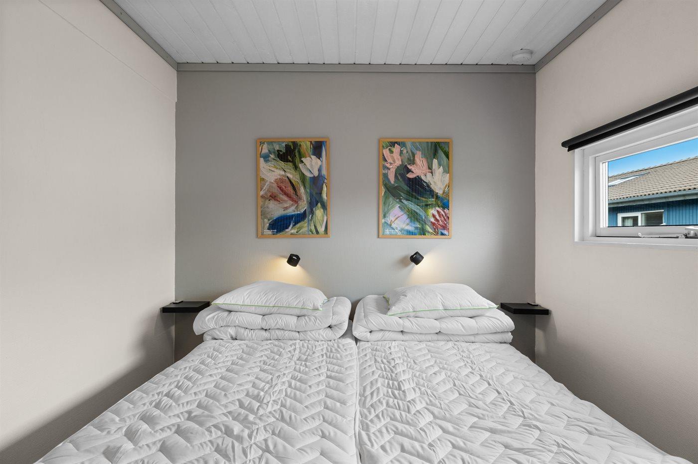Es gibt einen Schlafraum. 2 Schlafplätze in Einzelbetten. 2 Schlafplätze auf einer Doppelschlafcouch. 2 von diesen Schlafplätzen befinden sich im Wohnzimmer.