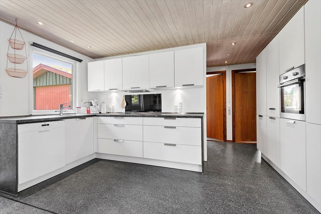 Obwohl man sich im Inneren des Hauses aufhält, hat man das Gefühl mitten in der Natur zu sein, denn durch die Fenster schaut man direkt auf die knorrigen Kiefern und das Heidekraut auf dem Grundstück. Diese Aussicht kann man unter anderem von dem schön modernisierten Wohnraum aus genießen, der mit einem Brennofen und einer tollen, offenen Küche ausgestattet ist.