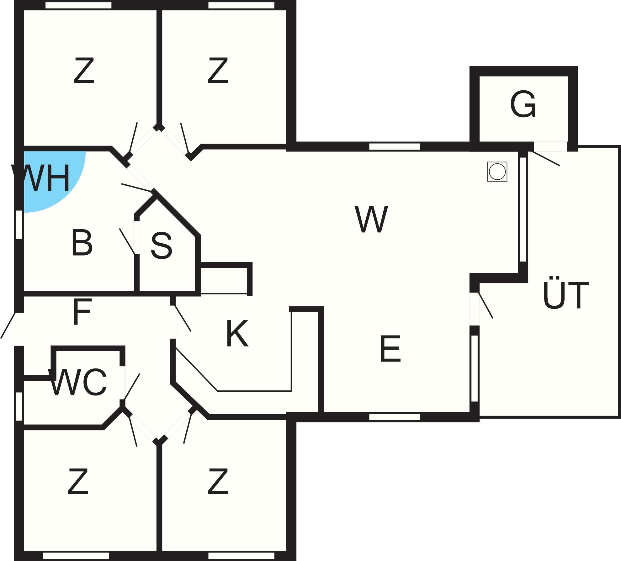 Das Ferienhaus hat einen offenen Küchen-/Wohnbereich für das Familienleben, inklusive Ess- und Sitzecke sowie Holzofen für kühlere Abende. Der Fernseher ist mit Chromecast ausgestattet, wodurch das Streamen verschiedener Streaming-Dienste möglich ist. Die Küchenausstattung ist umfassend und modern. Vom Wohnbereich hat man Zugang zu einer großen, teils abgeschirmten Terrassenfläche, die teils überdacht ist.