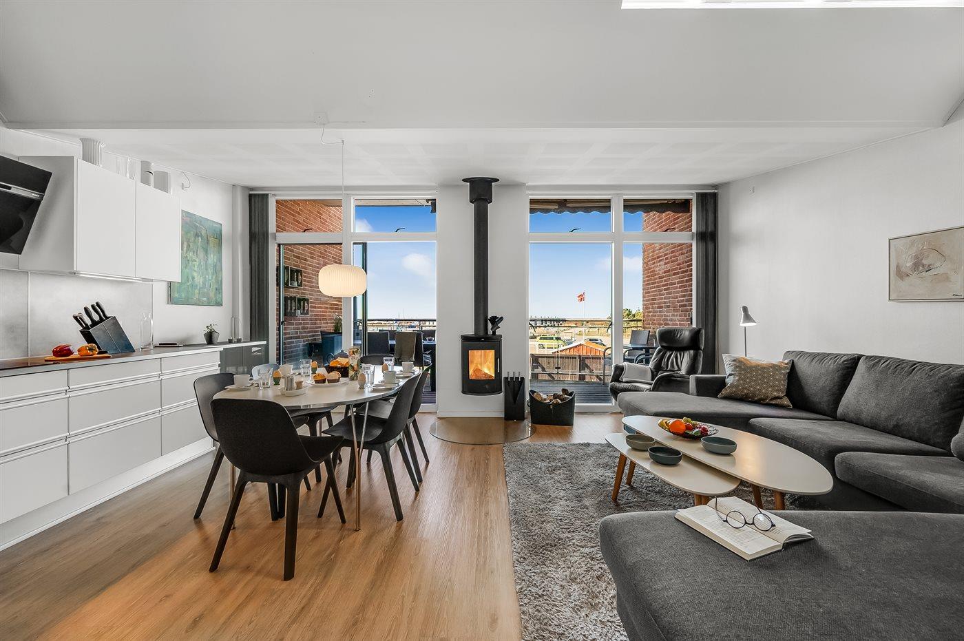 Genießen Sie traumhafte Sonnenuntergänge und Hafenblick in diesem modernen Ferienhaus in Hemmet, Dänemark.