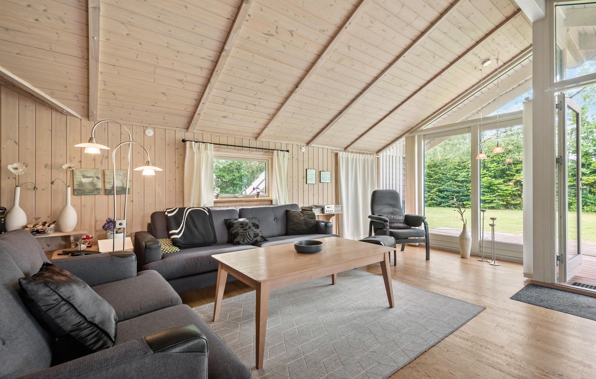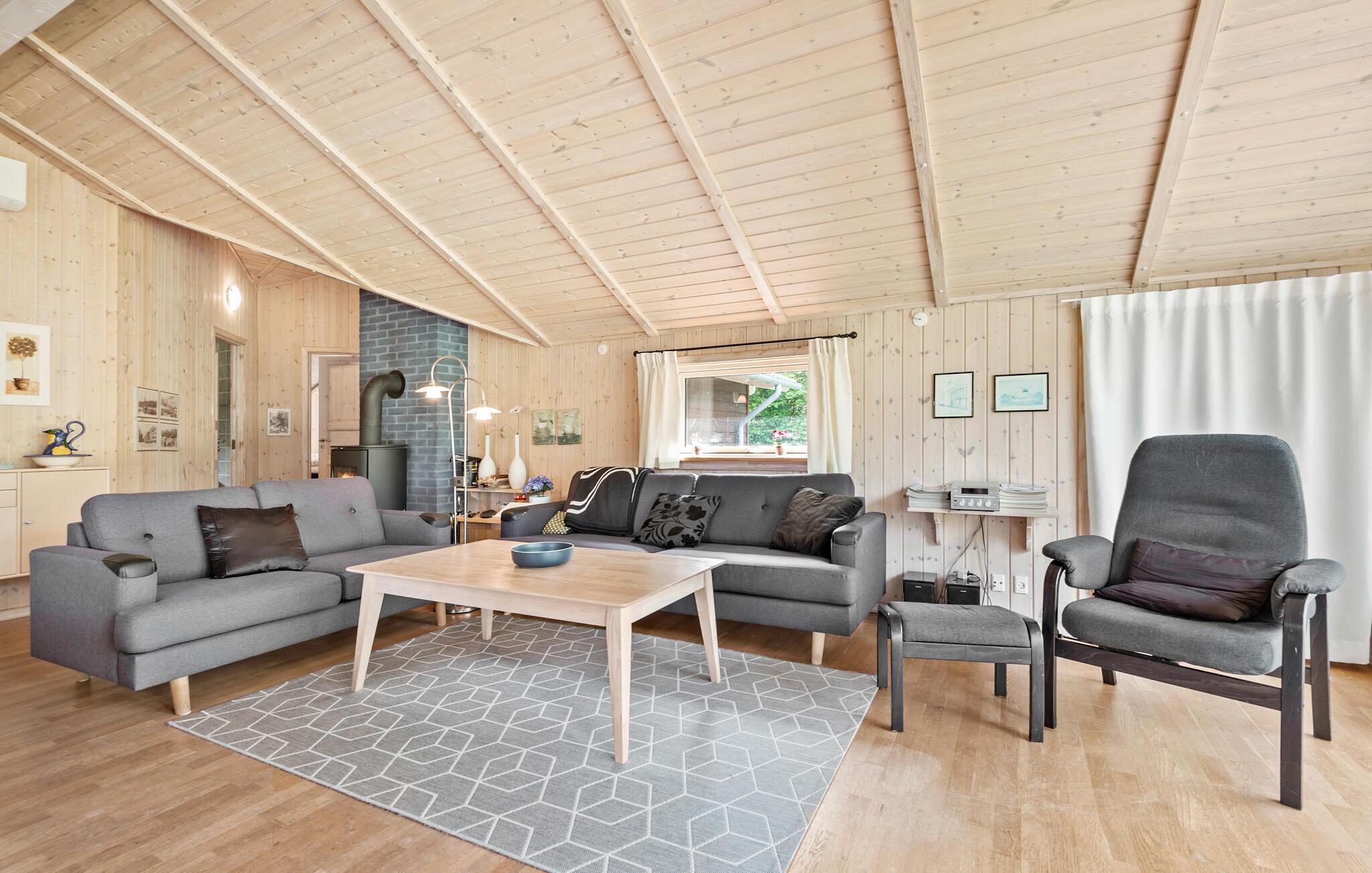Freuen Sie sich auf einen gelungenen Familienurlaub in diesem angenehmen Ferienhaus. Das hellgebeizte Holz schafft eine gemütliche Atmosphäre, die Sie im offenen Wohnraum, der die Küche, das Esszimmer und das Wohnzimmer miteinander verbindet. Befeuern Sie den Holzofen, schauen einen Film oder ziehen sich für Wellnessstunden in das Badezimmer mit Sauna und Whirlpool-Badewanne zurück.