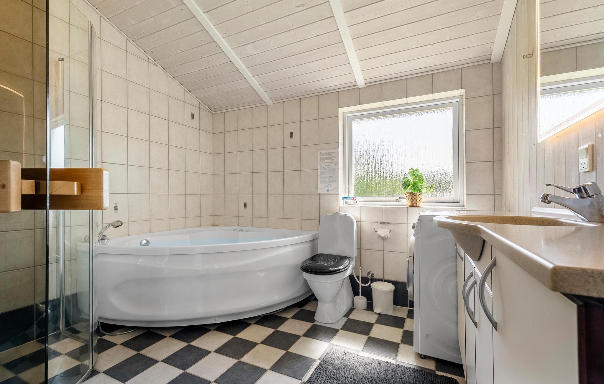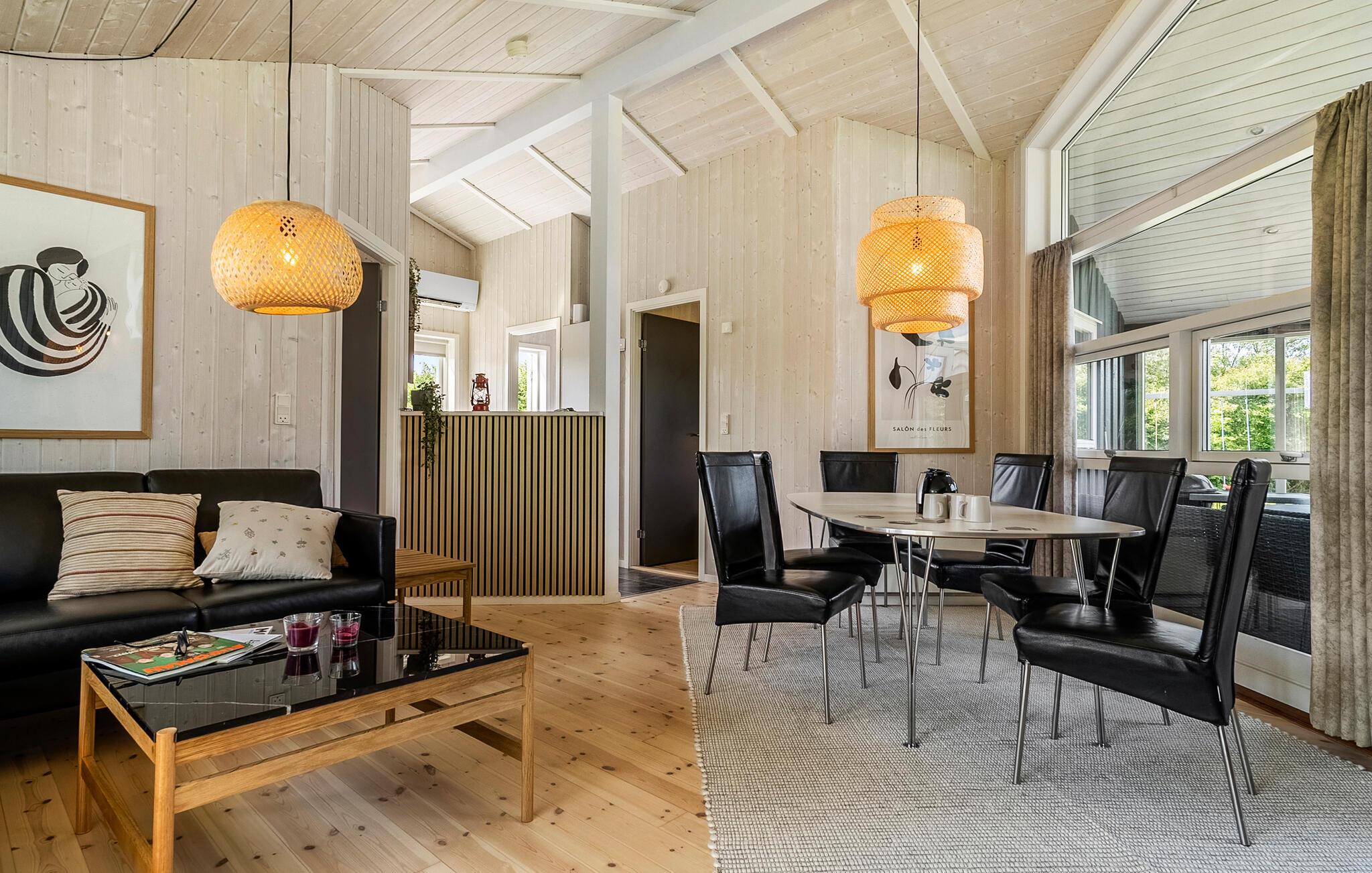 Machen Sie es sich im schön gestalteten Wohnbereich mit Kaminofen und großen Fenstern gemütlich. Entspannen Sie auf dem bequemen Sofa und lassen Sie den Tag bei einem Film oder einem Brettspiel ausklingen. Kochen Sie gemeinsam in der Küche mit direktem Zugang zur Terrasse. Die offene Raumaufteilung schafft eine einladende Atmosphäre. Im Badezimmer erwartet Sie ein Whirlpool, ideal für eine Auszeit am Abend. Gönnen Sie sich außerdem einen Saunagang und lassen Sie die Wärme auf sich wirken.