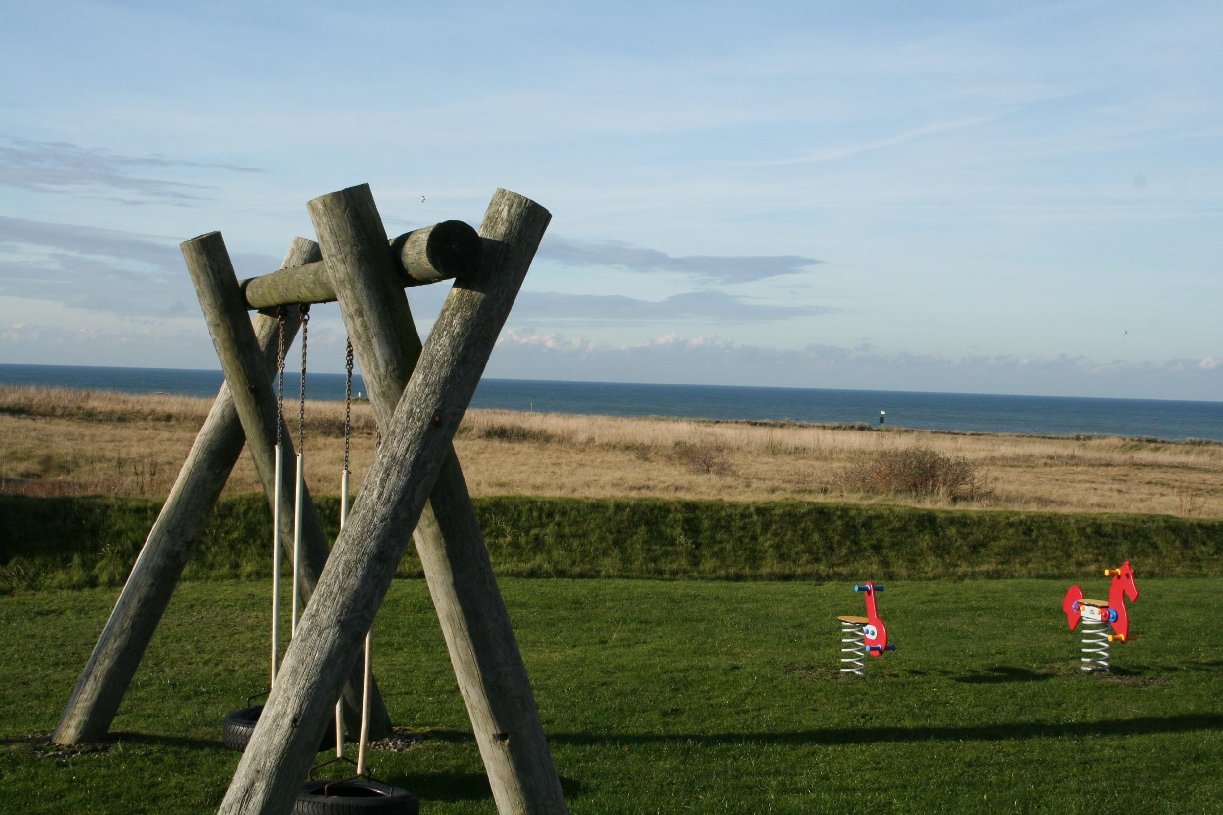 Die Umgebung bietet große Grünflächen mit viel Platz zum Spielen und Entspannen. In der Nähe des Hauses gibt es zudem eine Schaukel und zwei Wipptiere.