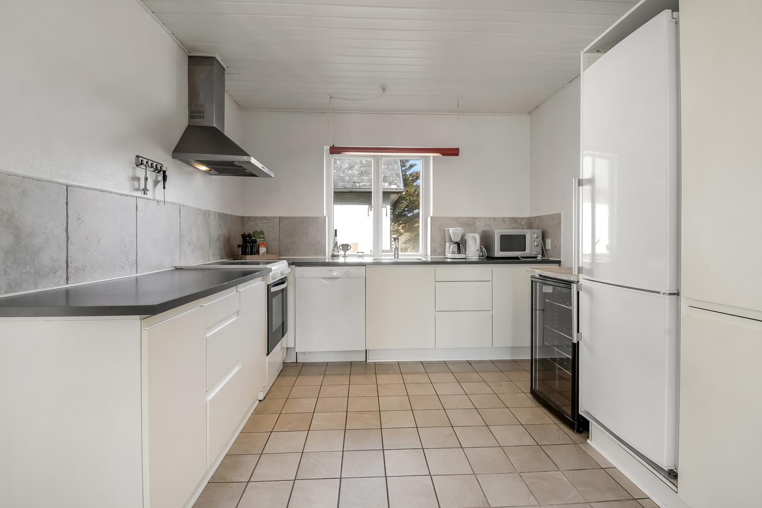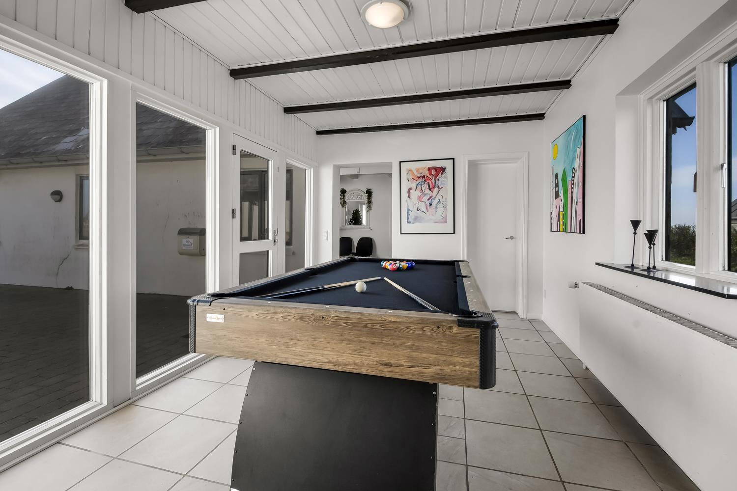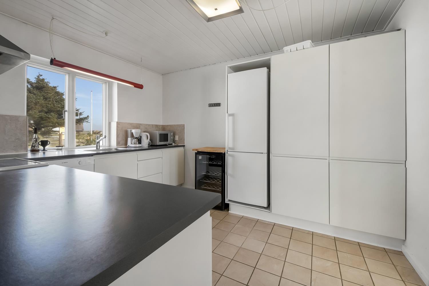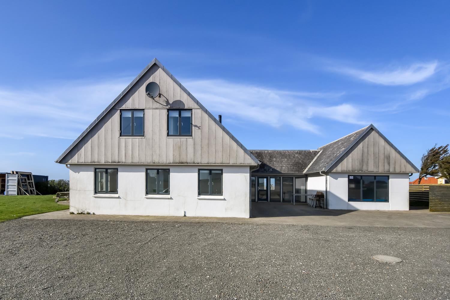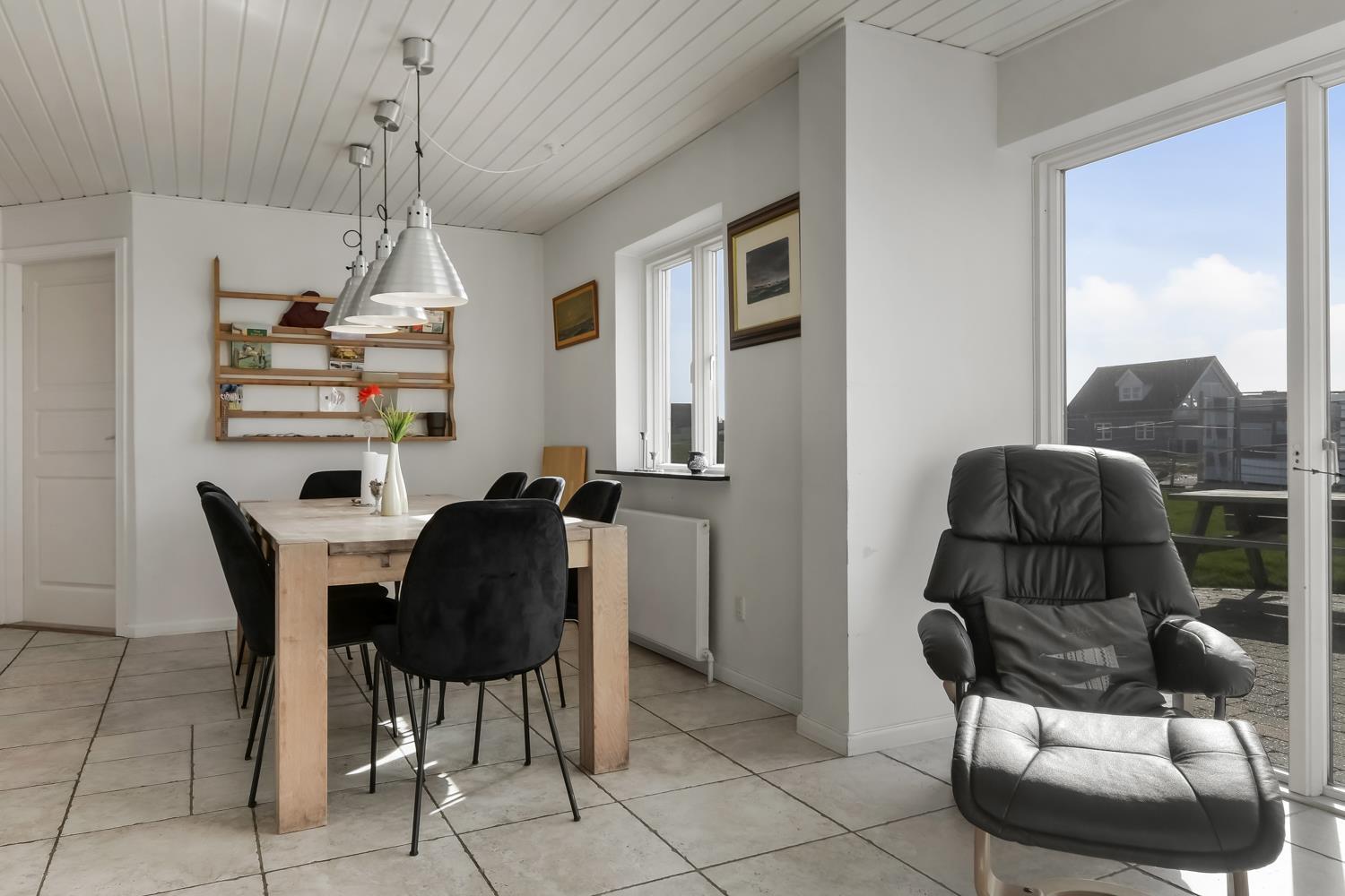 Das geräumige Steinhaus ist gut ausgestattet und hat fast im ganzen Haus Fliesenboden, nur die Schlafzimmer unten hat alle Holzboden. Im Obergeschoss befindet sich das Wohnzimmer mit einem Holzofen, Flachbildschirm-TV mit dänischem (DR1, TV2) und deutschem Programm (Satellitenempfang), DVD- und CD-Player. Hier können Sie ein gutes Buch lesen, dem Knistern des Ofens lauschen oder am Fenster sitzend den herrlichen Blick auf die Nordsee genießen. Außerdem gibt es hier 2 Schlafzimmer mit Einzelbetten (2 EB) und Doppelbett (1 DB) und oben gibts Holzboden. Im Erdgeschoss befindet sich eine gut ausgestattete Küche, u. a. mit Cerankochfeld, Geschirrspülmaschine, Mikrowelle und 70 L Gefrierfach. Von der Küche gelangt man in das Esszimmer mit einer schönen Aussicht über die Landschaft. In der unteren Etage befinden sich zudem 3 geräumige Schlafzimmer mit Doppelbetten (DB): 1 DB + 1 DB + 1 DB. Für die Kleinen stehen Kinderbett und Hochstuhl zur Verfügung. Das Haus hat 2 Badezimmer mit Fußbodenheizung und Dusche. Im geräumigen Poolraum befinden sich der Pool und ein großer 4-Personen-Whirlpool mit Ausblick auf die Nordsee. Von hier hat man Zugang zu Sauna und Dusche. Waschmaschine und Wäschetrockner sind vorhanden. 1 Haustier ist erlaubt. Kaution Wintersaison EUR 600 und Sommersaison EUR 300. Nichtraucher-Haus.