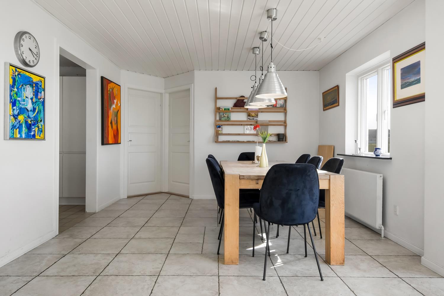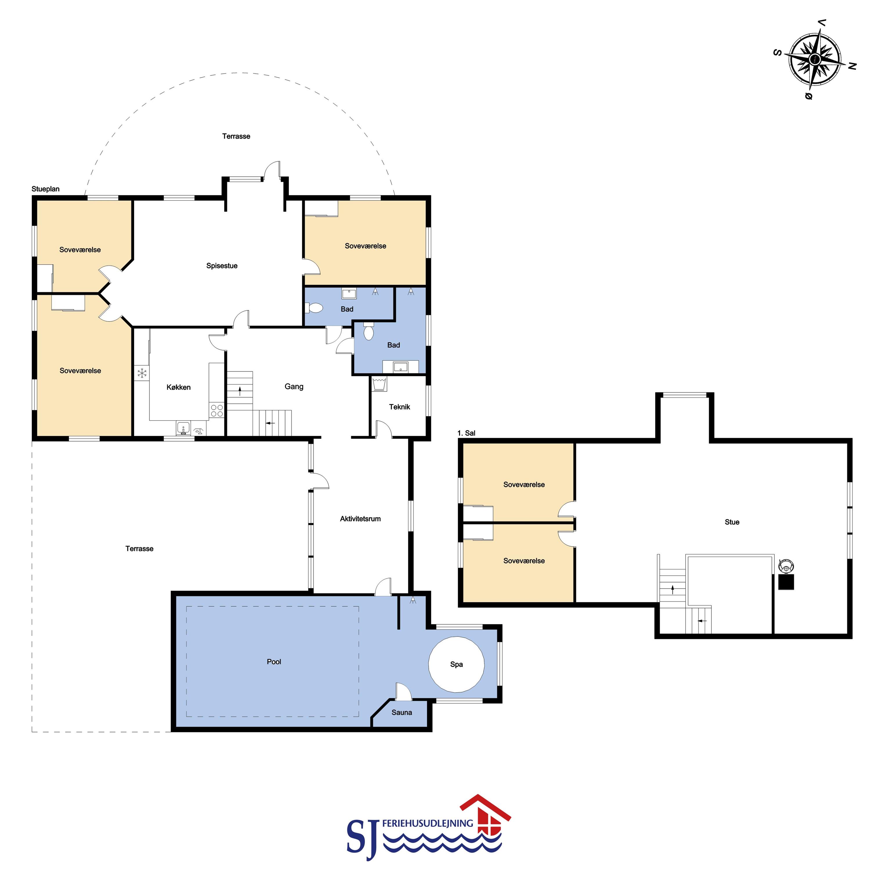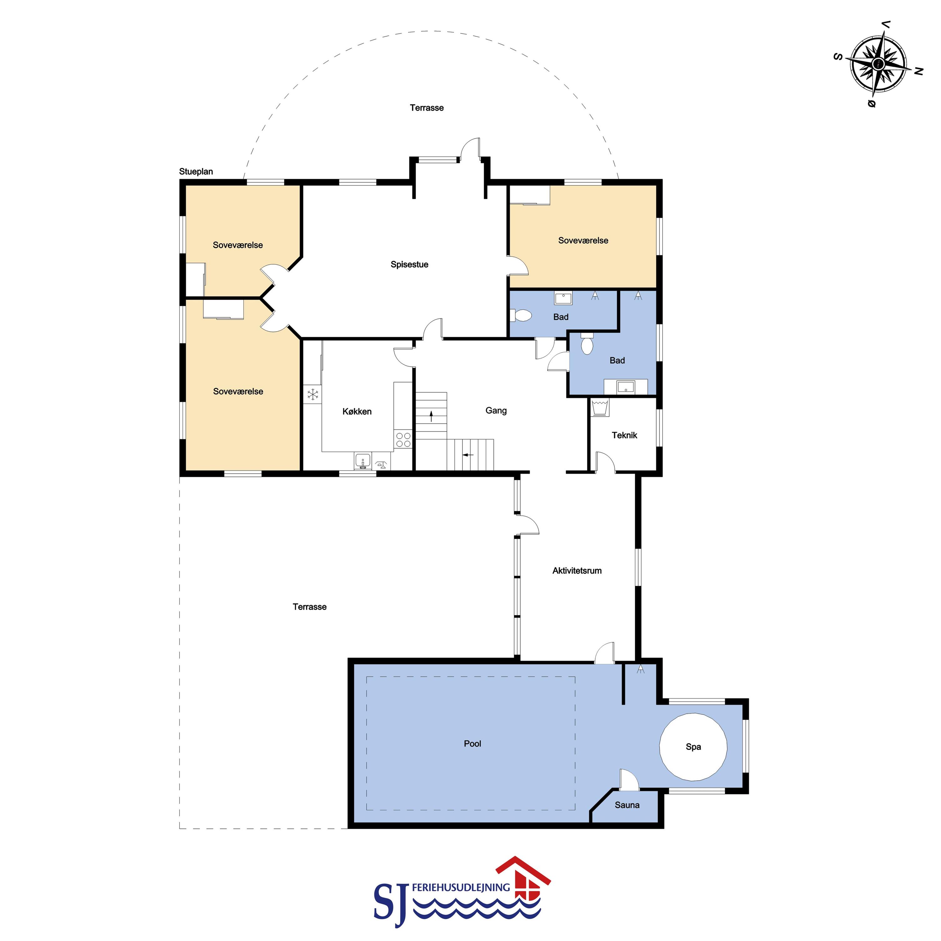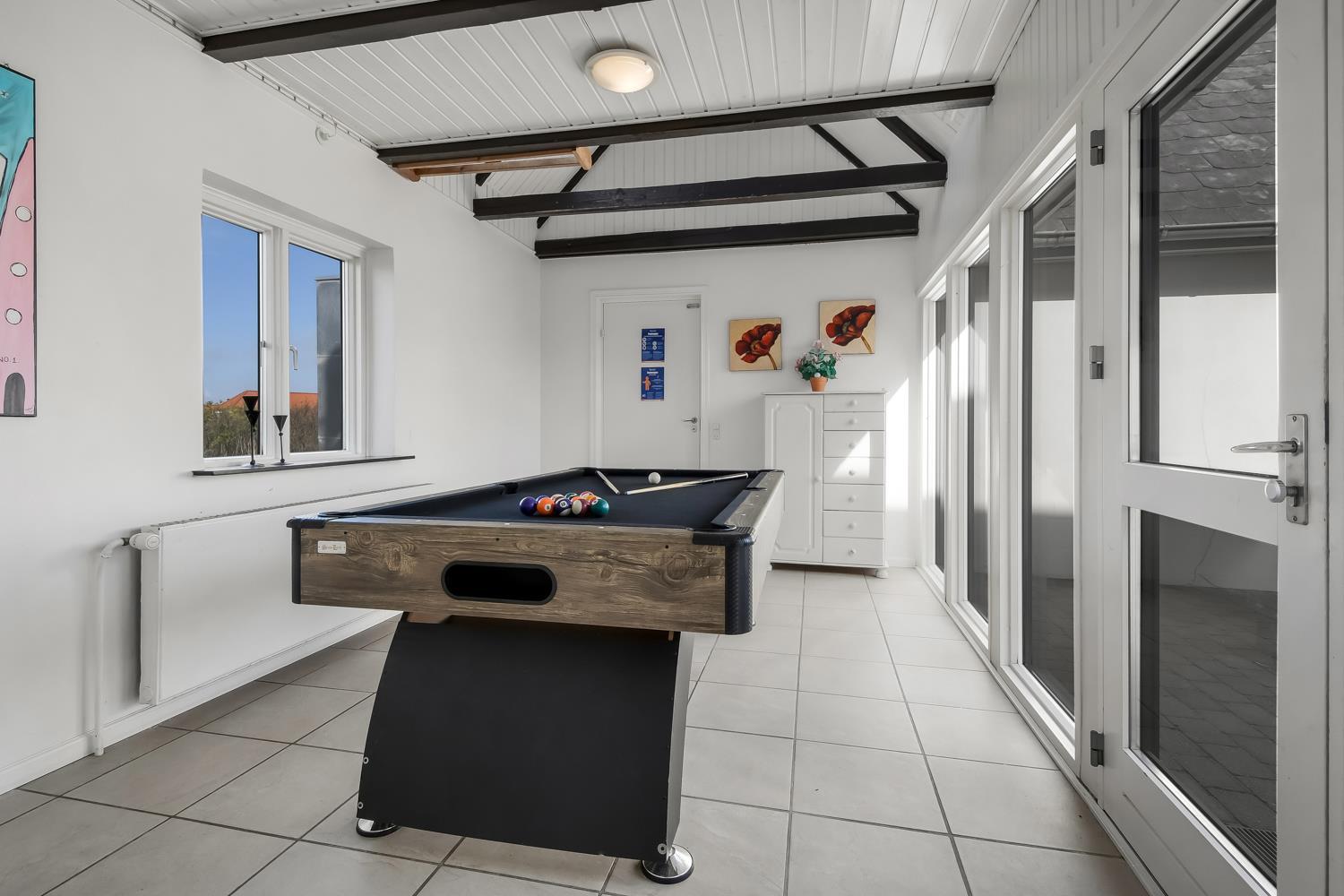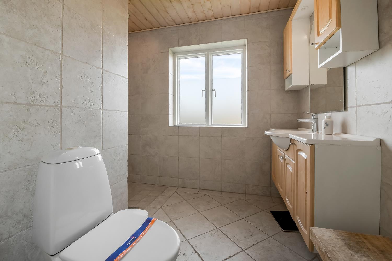 Das geräumige Steinhaus ist gut ausgestattet und hat fast im ganzen Haus Fliesenboden, nur die Schlafzimmer unten hat alle Holzboden. Im Obergeschoss befindet sich das Wohnzimmer mit einem Holzofen, Flachbildschirm-TV mit dänischem (DR1, TV2) und deutschem Programm (Satellitenempfang), DVD- und CD-Player. Hier können Sie ein gutes Buch lesen, dem Knistern des Ofens lauschen oder am Fenster sitzend den herrlichen Blick auf die Nordsee genießen. Außerdem gibt es hier 2 Schlafzimmer mit Einzelbetten (2 EB) und Doppelbett (1 DB) und oben gibts Holzboden. Im Erdgeschoss befindet sich eine gut ausgestattete Küche, u. a. mit Cerankochfeld, Geschirrspülmaschine, Mikrowelle und 70 L Gefrierfach. Von der Küche gelangt man in das Esszimmer mit einer schönen Aussicht über die Landschaft. In der unteren Etage befinden sich zudem 3 geräumige Schlafzimmer mit Doppelbetten (DB): 1 DB + 1 DB + 1 DB. Für die Kleinen stehen Kinderbett und Hochstuhl zur Verfügung. Das Haus hat 2 Badezimmer mit Fußbodenheizung und Dusche. Im geräumigen Poolraum befinden sich der Pool und ein großer 4-Personen-Whirlpool mit Ausblick auf die Nordsee. Von hier hat man Zugang zu Sauna und Dusche. Waschmaschine und Wäschetrockner sind vorhanden. 1 Haustier ist erlaubt. Kaution Wintersaison EUR 600 und Sommersaison EUR 300. Nichtraucher-Haus.