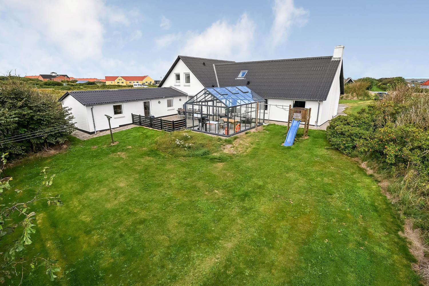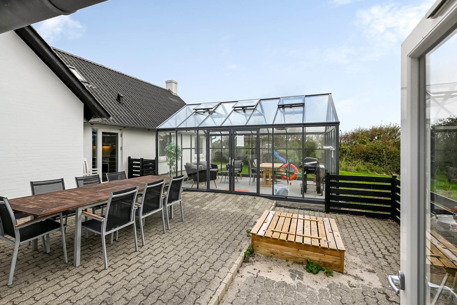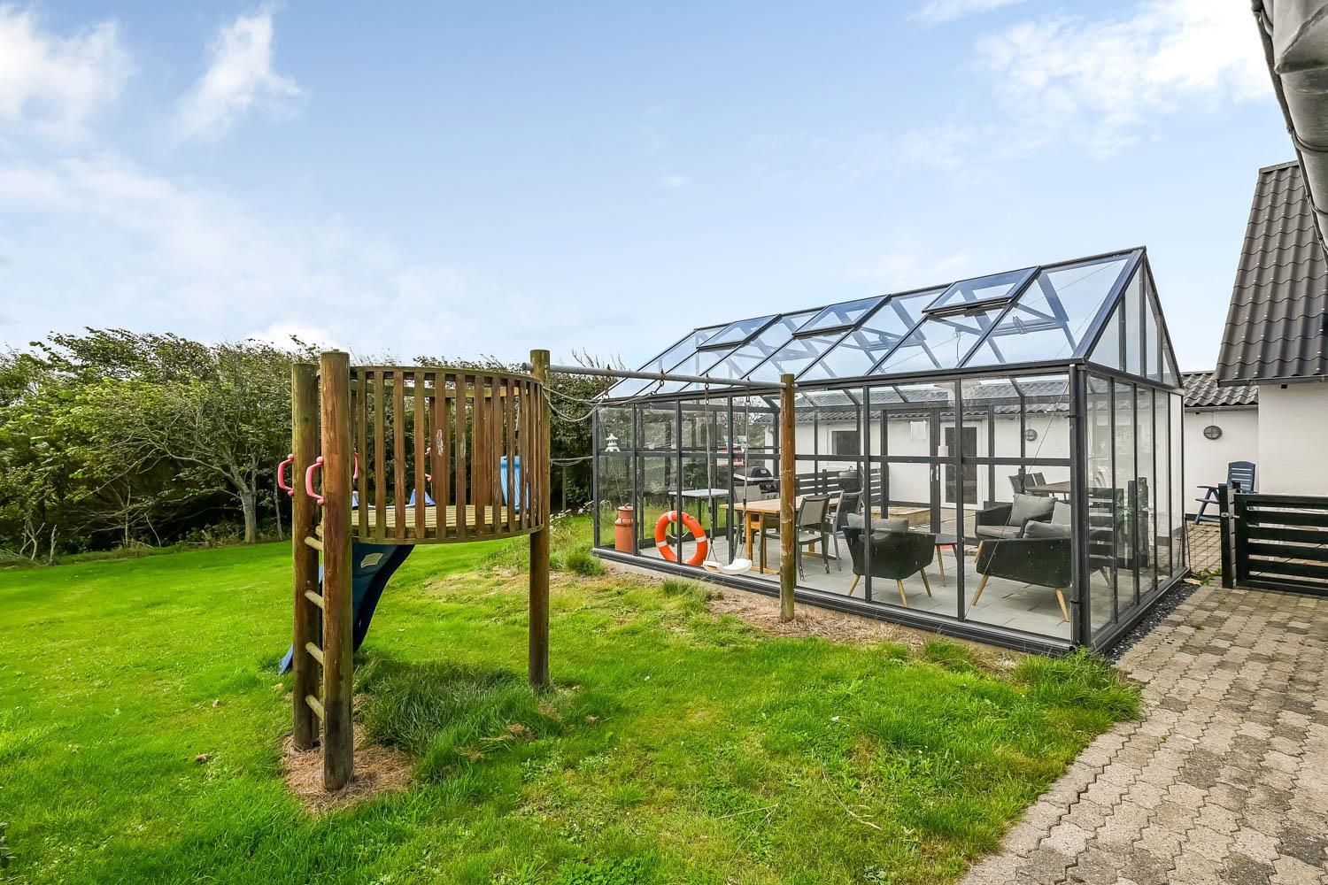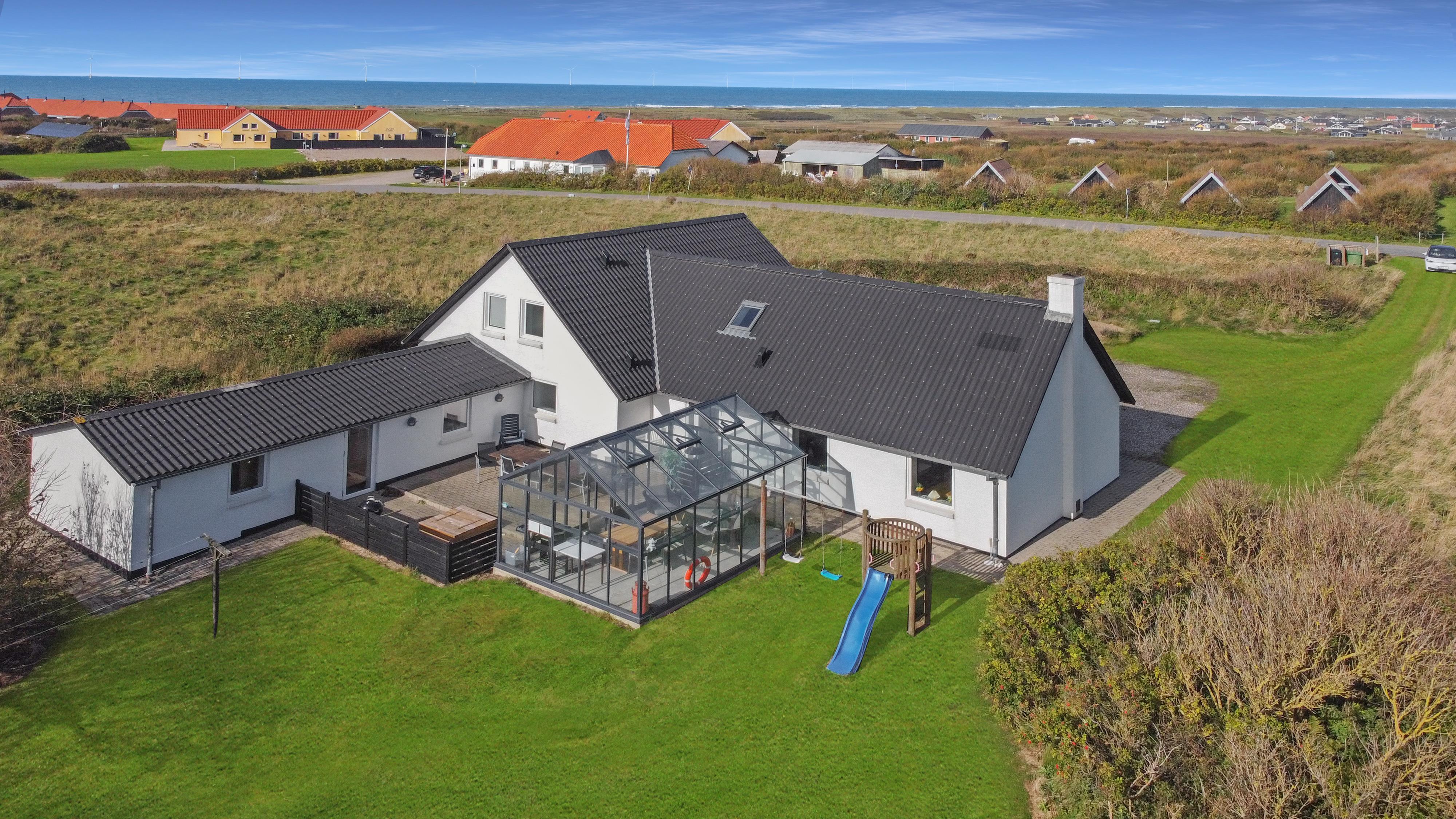 Die Terrasse ist mit einem Geländer eingezäunt, sodass weder Hunde noch Kinder unbeaufsichtigt hinauslaufen können. Es stehen Gartenmöbel, Sonnenliegen und ein Grill zur Verfügung. Im Garten befinden sich außerdem ein Sandkasten sowie ein Spielturm mit Schaukeln und Rutsche. Rund um das Haus sind Pflastersteine verlegt. Das Haus liegt in der Nähe des Jens-Søndergård-Museums und nicht weit vom Leuchtturm Bovbjerg Fyr entfernt. Genießen Sie einen wunderbaren Spaziergang oder Lauf auf dem Weg entlang der Steilküste von Bovbjerg Klint mit einzigartigem Blick auf die Nordsee. Erleben Sie, wie die Nordsee jeden Tag eine neue Geschichte erzählt. Viele Sehenswürdigkeiten und Ausflugsziele sind innerhalb von maximal 30 Minuten erreichbar. Besuchen Sie auch den Fischerort Thyborøn oder die gemütliche Handelsstadt Lemvig mit zahlreichen Fachgeschäften. In den Sommermonaten können die wichtigsten Einkäufe auf dem Campingplatz Bovbjerg erledigt werden.