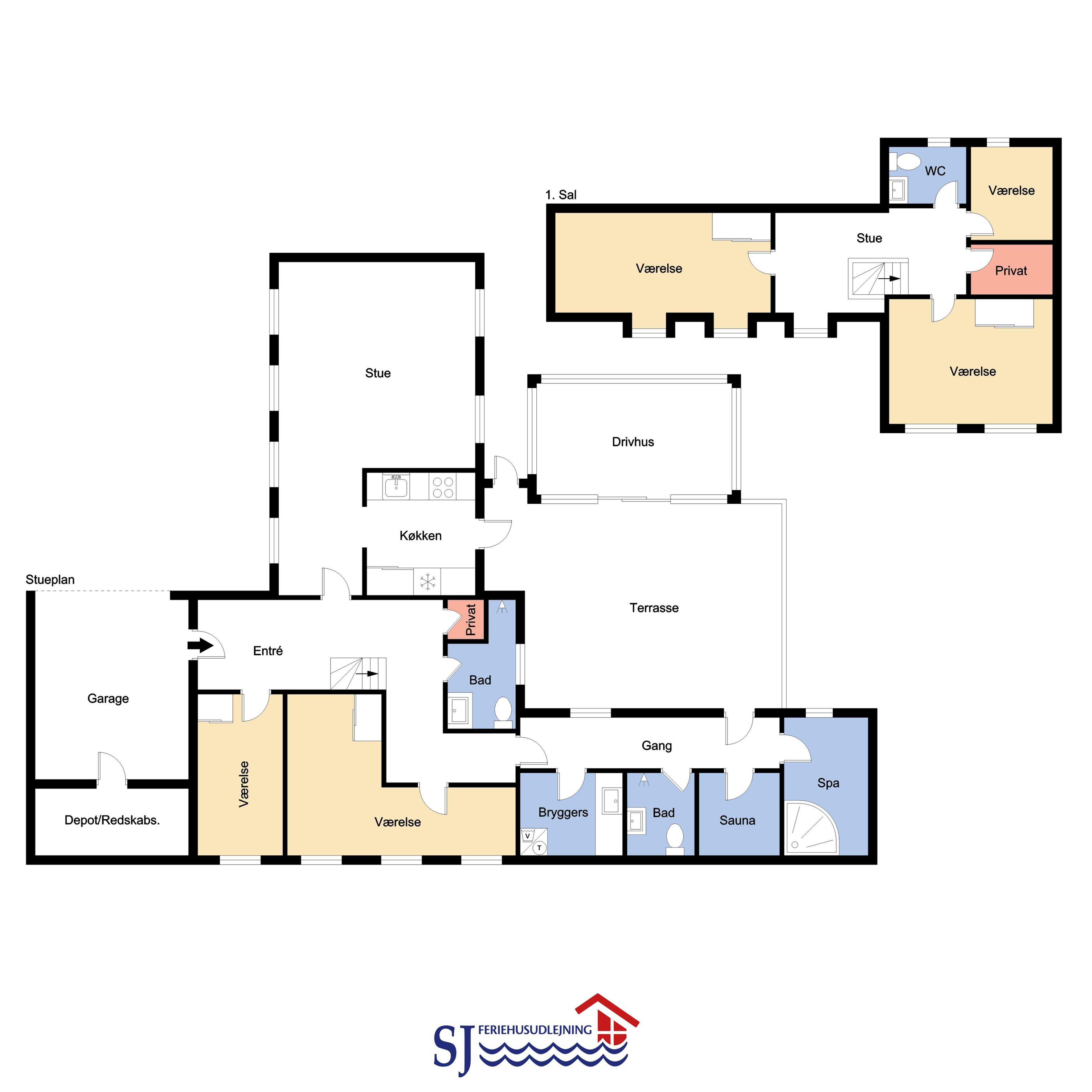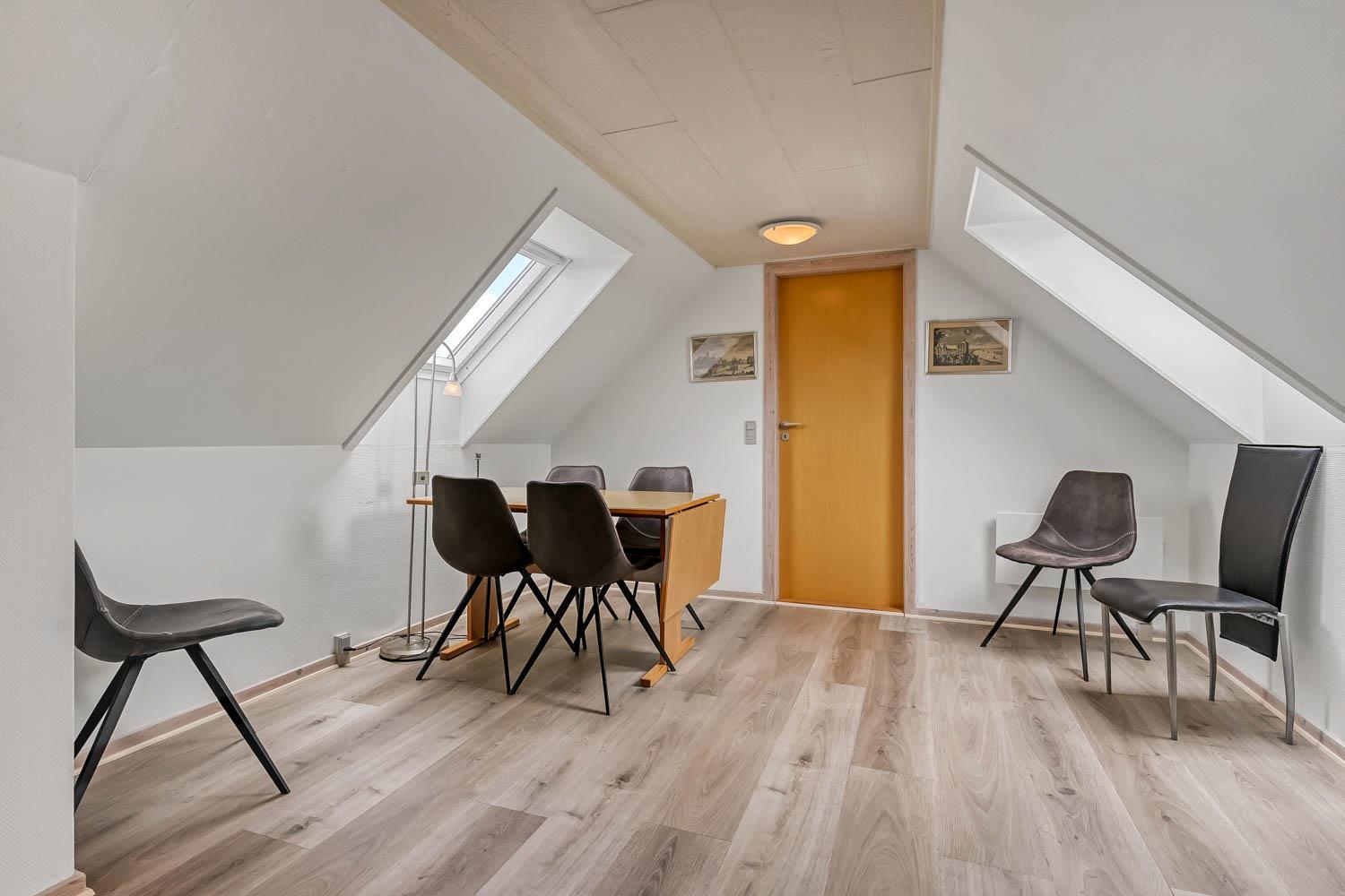 Nehmen Sie die Treppe vom Eingang bis zum 1. Stock. Hier befindet sich ein schöner Flur mit Sitzgelegenheiten und Zugang zur kleinen Gästetoilette mit WC und Waschbecken. 3 Schlafräume 1DB + 1DB + 2B, die alle einen atemberaubenden Blick über die Nordsee oder die hügelige Landschaft bieten.Das Haus ist durch einen praktischen Anbau über den hinteren Durchgang erreichbar. Hier haben Sie Zugang zum Hauptschlafzimmer (1DB) mit zusätzlichem Sofa und Couchtisch, wo Sie bequem ein gutes Buch genießen können. Von hinten gibt es einen zusätzlichen Ausgang zur Terrasse Von hier aus erlangt man Zugang zum fantastischen Orangerie, wo man sitzen und den Ausblick auf die Felder genießen kann. Extra Haushaltsraum mit praktischer Spüle, Vorratsschränken und Waschmaschine. Es gibt hier auch eine Toilette mit Waschbecken. Separater Zugang zur großen Sauna und separater Zugang zu einem weiteren Badezimmer mit Dusche. Am Ende des Flurs befindet sich ein hübscher Raum mit Whirlpool, Heimtrainer und Crosstrainer. Perfekt für diejenigen, die aktiv sind oder sich mit einem Whirlpool verwöhnen möchten. Es gibt geflieste Böden mit Fußbodenheizung im gesamten Anbau. Kinderbett und Kinderstuhl gibt es für die Kleinsten.