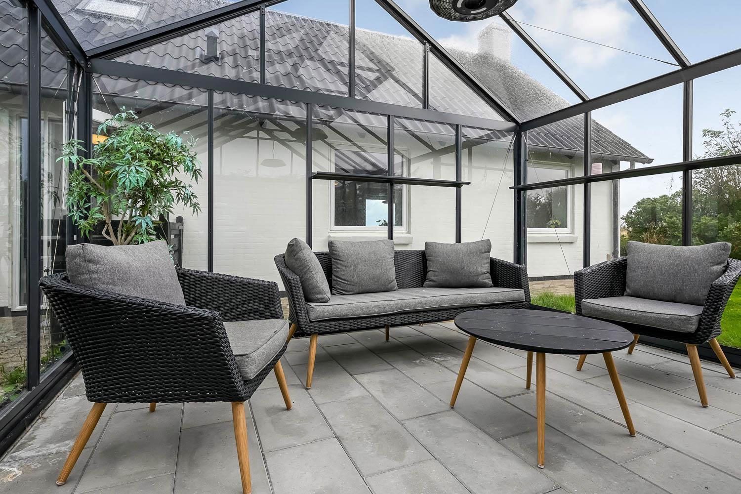 Das 5.000 m² große Grundstück bietet viel Platz, und der Garten ist dank der üppigen Bepflanzung gut vor Wind geschützt und angenehm uneinsehbar. Von der Terrasse aus haben Sie direkten Zugang zu dem großen, schönen Orangerie-Gewächshaus, das mit komfortablen Loungemöbeln sowie einem Esstisch und Stühlen eingerichtet ist. Hier können Sie geschützt im Innenbereich sitzen und die herrliche Aussicht auf die umliegenden Felder und die ruhige Landschaft genießen – ideal zum Entspannen und für gemütliche Mahlzeiten bei jedem Wetter.