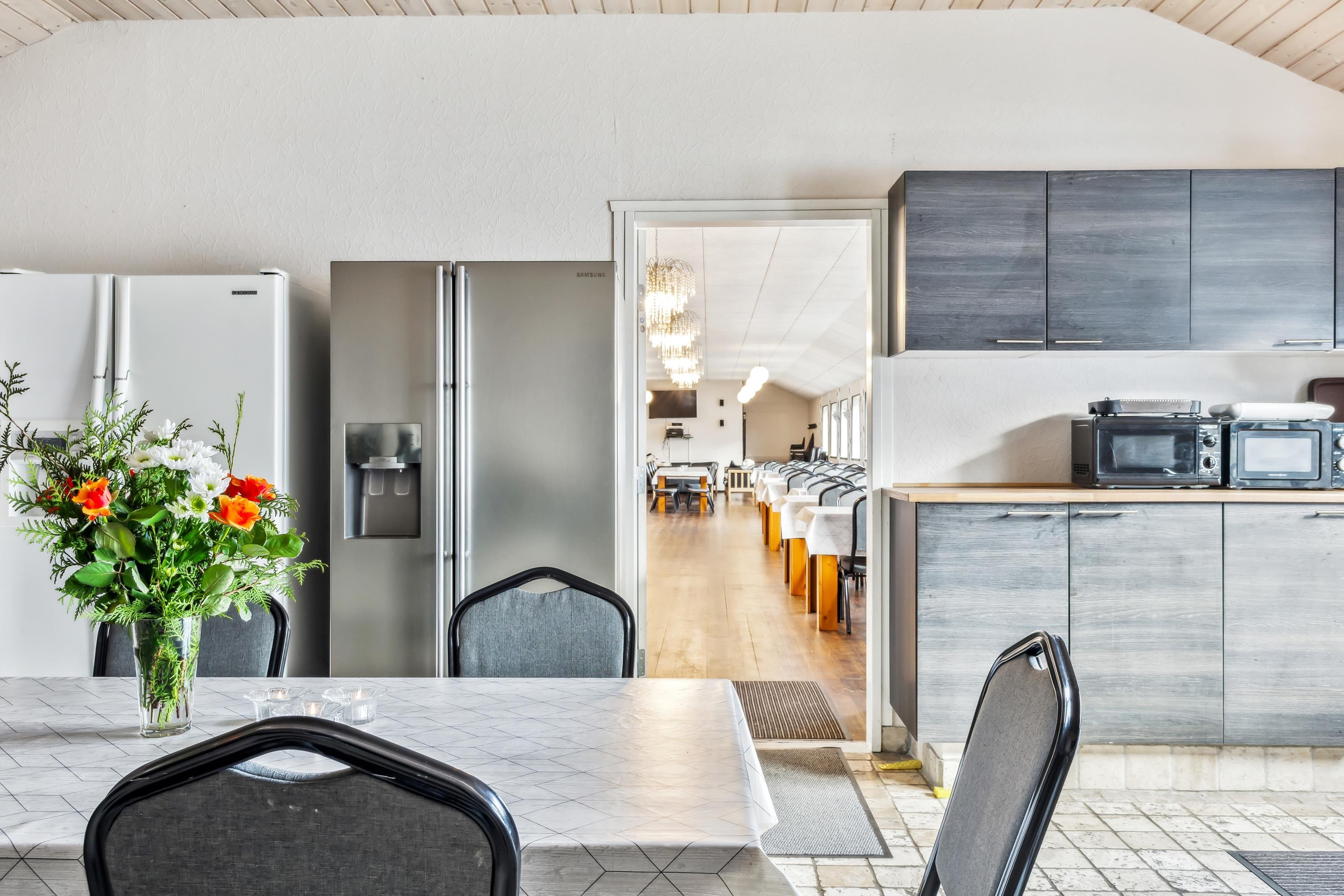 Die Küche ist mit allem Zubehör für die Feier ausgestattet: Geschirr zum Decken, 2 Spülmaschinen, 5 Kühlschränke, 2 Herde mit Backofen.