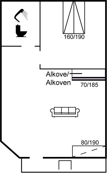 Es gibt einen Schlafraum. 2 Schlafplätze in einem Doppelbett. Ein Schlafplatz auf einer Schlafcouch. 2 Schlafplätze im Alkoven.