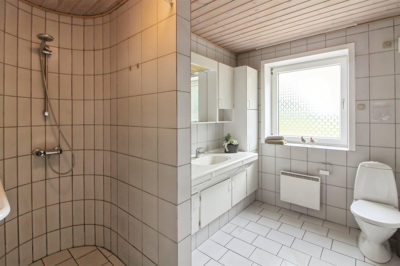 Es gibt 1 Badezimmer mit Duschnische und 2 Toiletten, davon 1 Gästetoilette. Fußbodenheizung in 1 Badezimmer.
